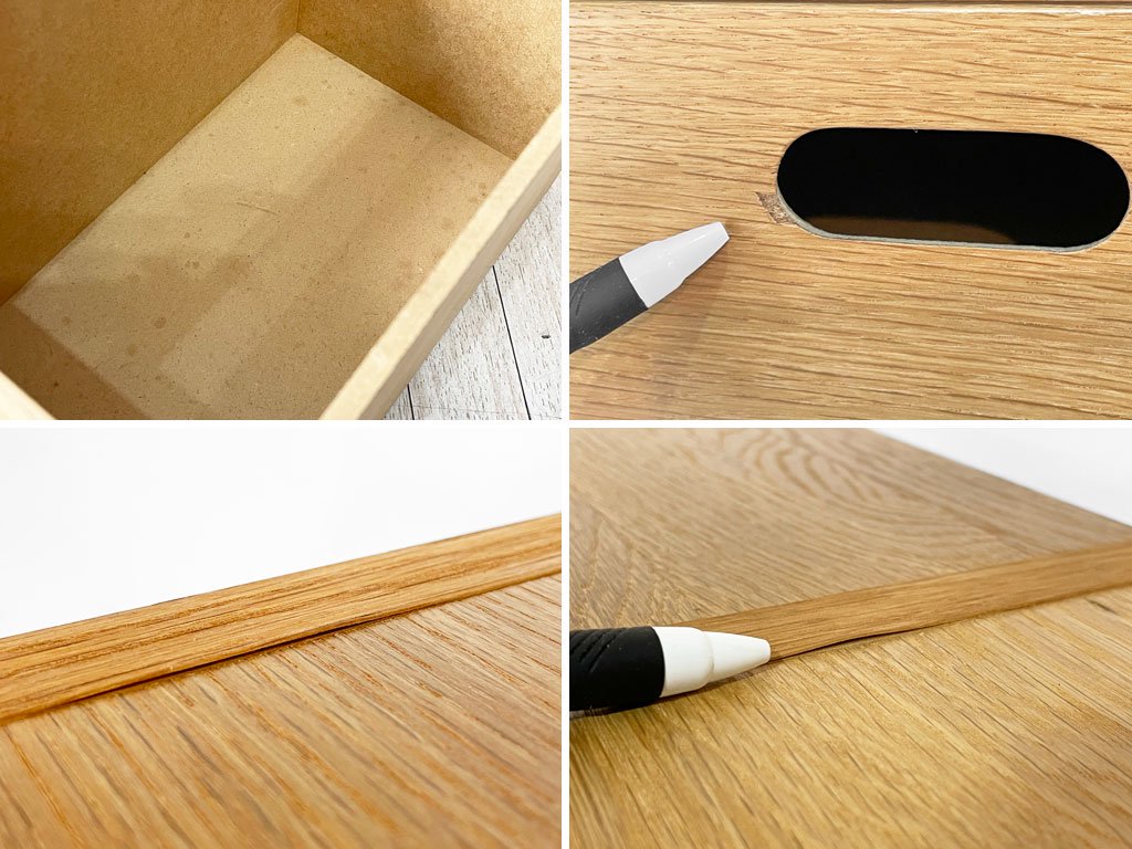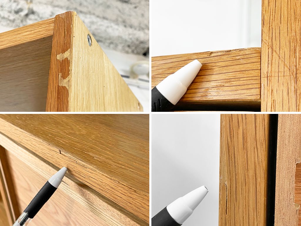 使用に伴い、傷や擦れ、打痕や落としきれない汚れ、色ムラや突板の浮きや欠けが見受けられます。また、チェストのドロワー内には薄染みが見受けれます。多少の使用感はございますが、ご使用に問題となるダメージは無く、これからも安心してご使用頂けるコンディションを保っております。