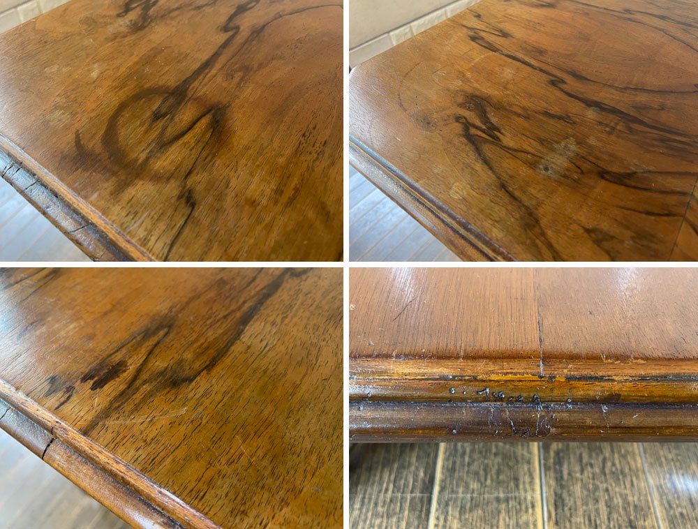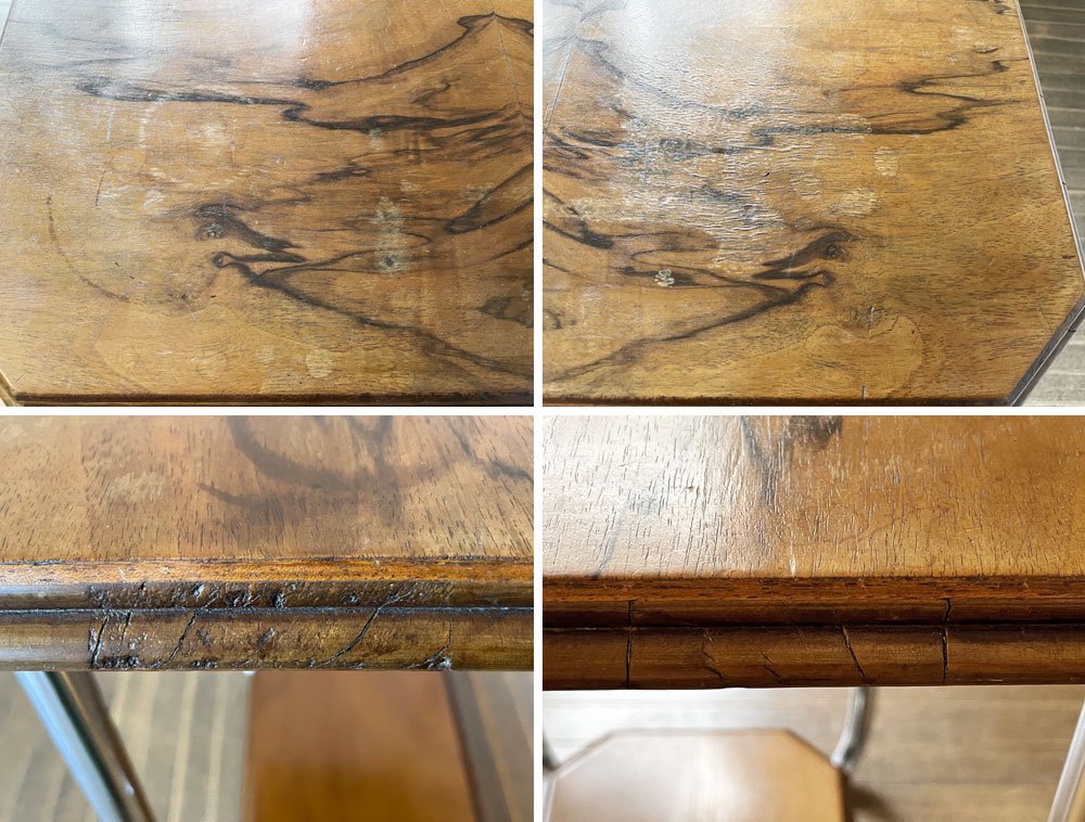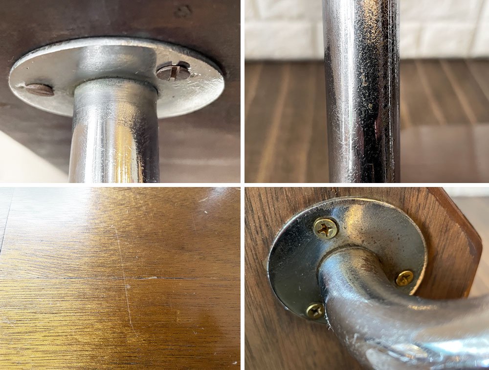 こちらはビンテージ品です。使用に伴う擦れ傷のほか、天板にはスクラッチ、線傷、打痕、輪ジミ、塗装表面の劣化や木部表面のヒビ、メッキのざらつき等全体的に年月相応の使用感が見られますが、いずれも著しく風合いを損なうものではございません。また下段棚板のネジは後年プラスネジに換装されておりますが普段目に留まる箇所ではない為、さほど気にならないかと思われます。ぐらつきといったご使用に問題となるダメージは無く、今後ともビンテージ品ならではの風合いを楽しみながら実用頂けるコンディションを保っております。