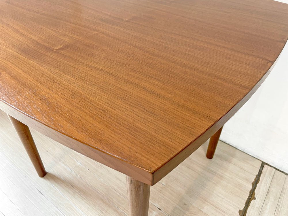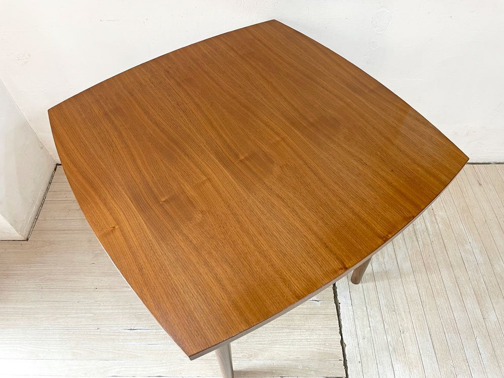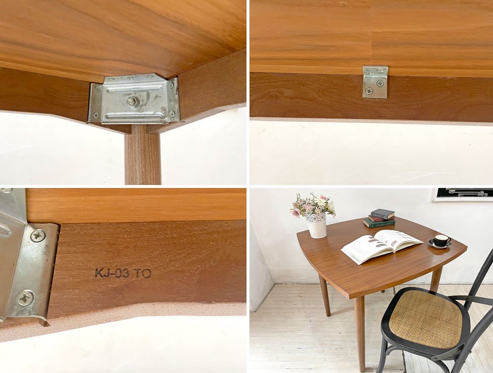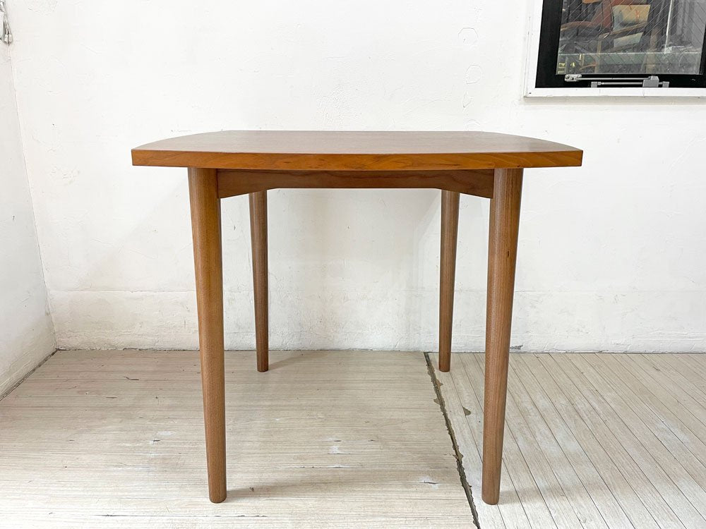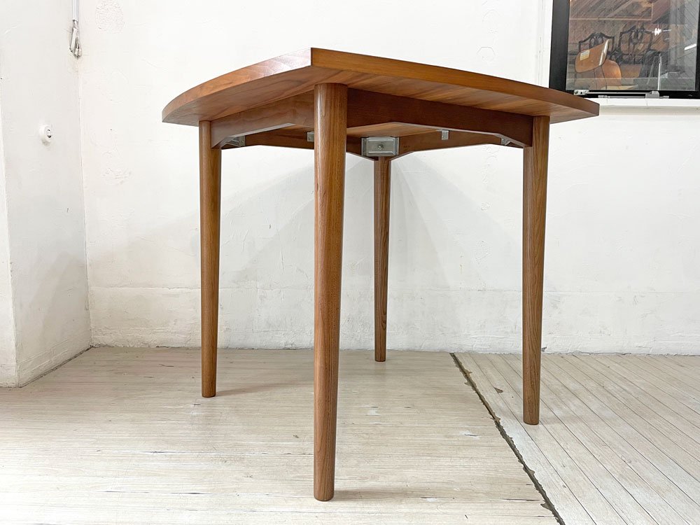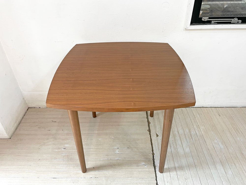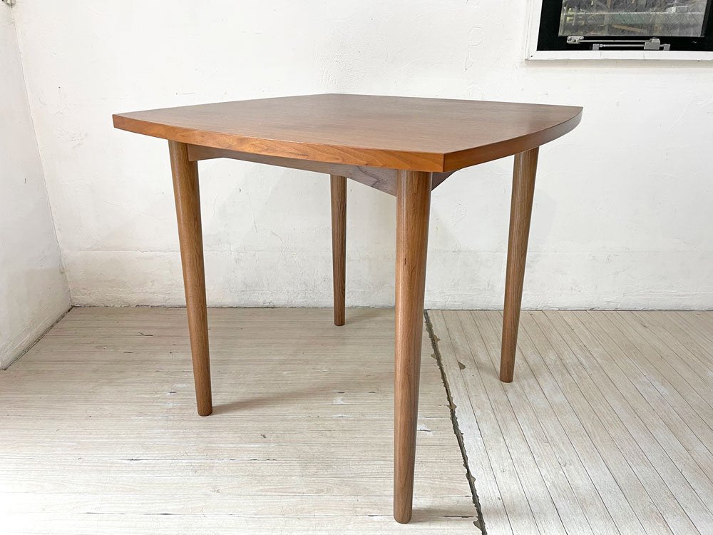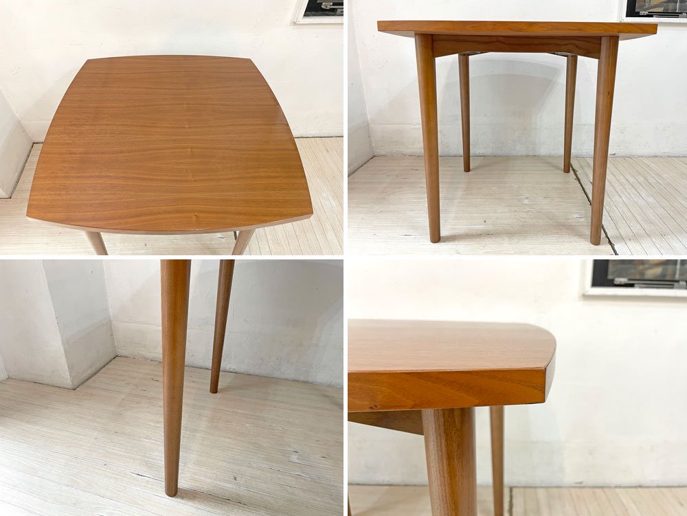 深みのあるウォールナット材を使用した木の温もり溢れる1点。天板縁の滑らかなカーブやテーパードの効いたスラッとした脚等、随所に北欧デザインの意匠が感じられるテーブルです。