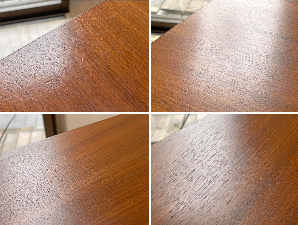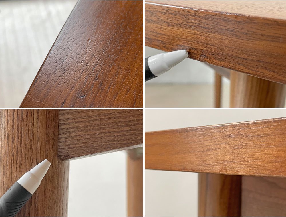 使用に伴い、天板表面には光の加減で確認できる線傷や打痕が散見されます。また脚部にも同様のダメージがございますが大きく目立つものではございません。その他グラつき等の大きなダメージは無く、これからも実用頂けるコンディションを保っております。