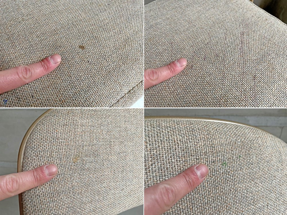 ファブリックにやや目立つインク汚れ、クッションの型崩れ、アーム先端に擦り切れのほか、フレームにペイントロスを伴う打痕、ラバーグライズの薄いひび割れ、クリーニングで落としきれない汚れといった使用感がございます。