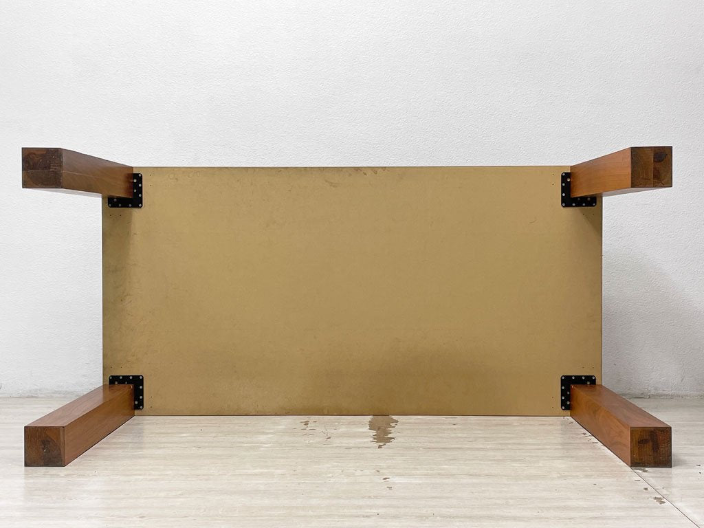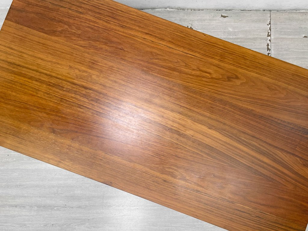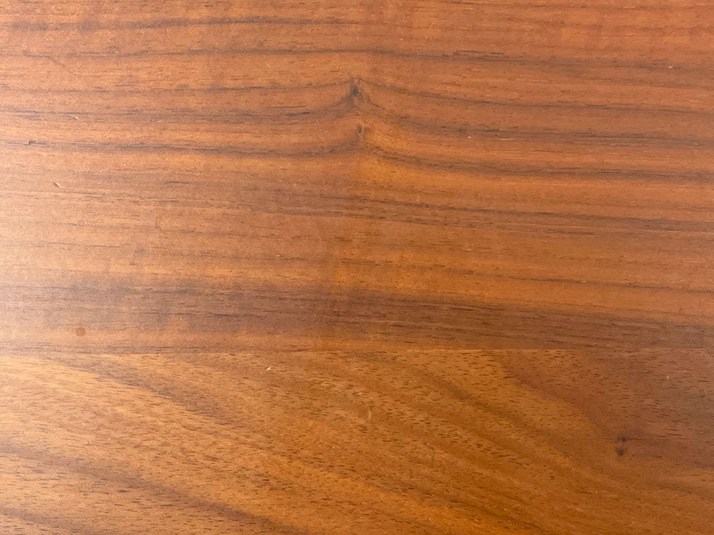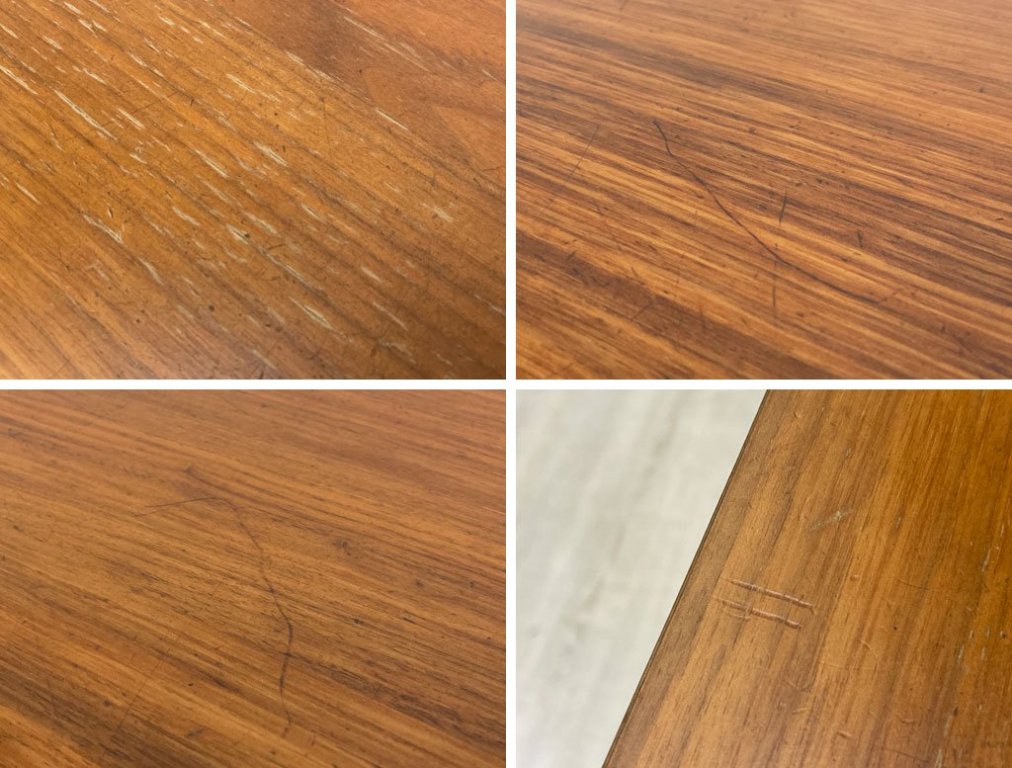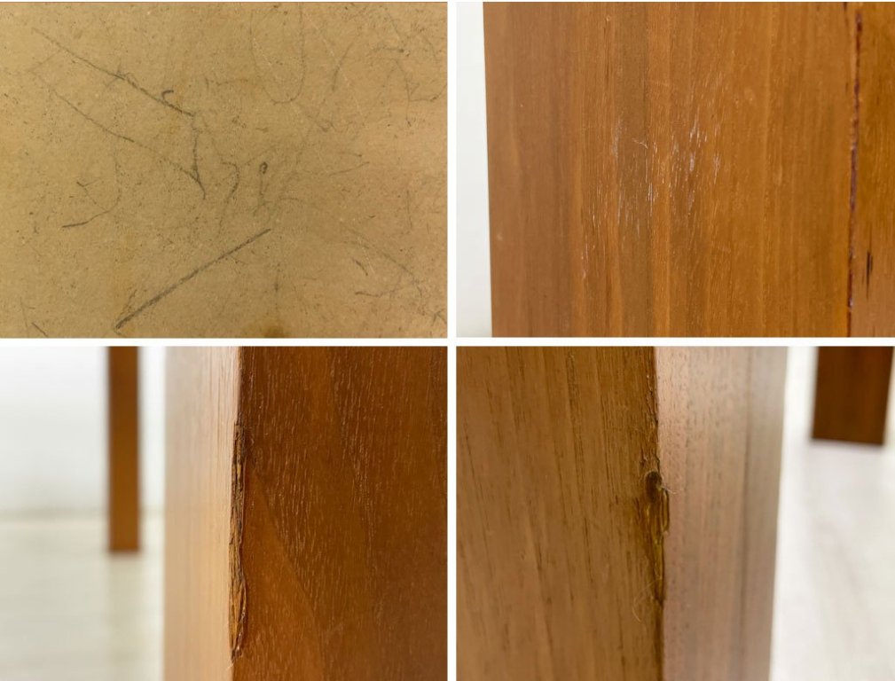 天板には浮きとそれに伴うザラツキと色ムラ、天板裏には染みや落書きが複数箇所ございます。また、若干ではございますが、天板の反りもございます。