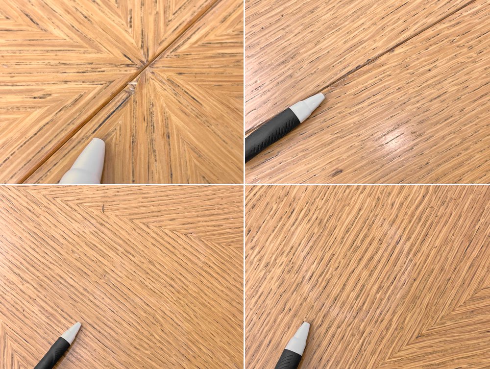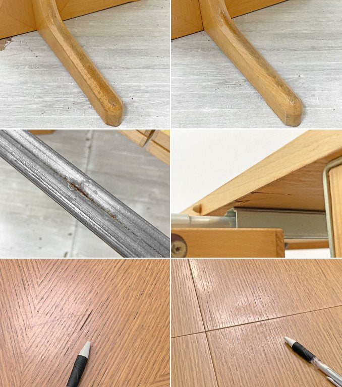使用に伴う擦れ傷の他、細かな打痕やスクラッチ、線傷、小さな突板の剥がれ、うっすらとした染み、主天板を中心とした黒ずみ、金具の軽度の錆くすみ、足先にはやや目立つ塗装表面の剥がれが見られる等やや使用感が見られますがいずれも大きく風合いを損なうものではございません。グラつき等ご使用に問題となるダメージは無く、引き続き気持ち良くお使い頂けるコンディションを保っております。