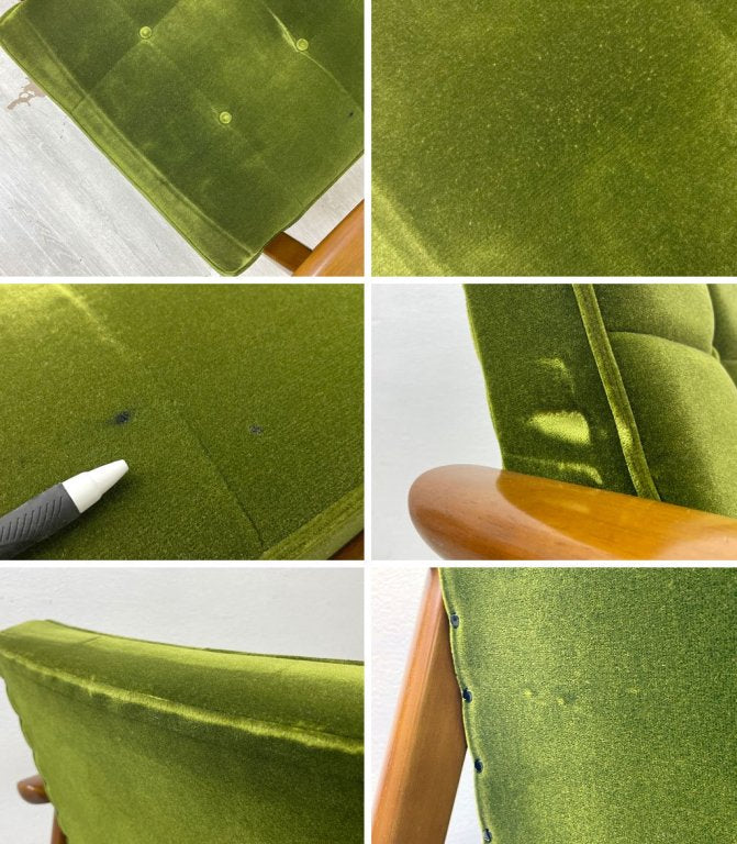 使用に伴い、フレームには擦れや打痕、線傷、塗装の削れ、補修ペンによるレタッチ痕などがございます。また、ファブリックには複数の圧痕や擦れ、シミ、日焼け、取り切れない汚れなどが見受けられます。全体的に使用感がございますが、使用上問題となる大きなダメージはございません。