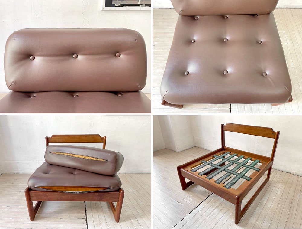 チークと思われる無垢材を惜しげもなく使用したフレームは、エッジを滑らかに落としてあり、丁寧な木工に好感が持てる一脚。広く設けられた座面には肉厚なクッションが乗り、老若男女問わずくつろげるサイズ感もポイントです。