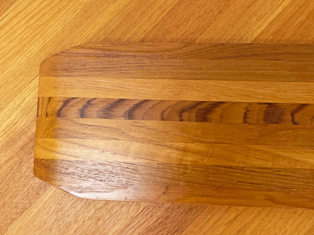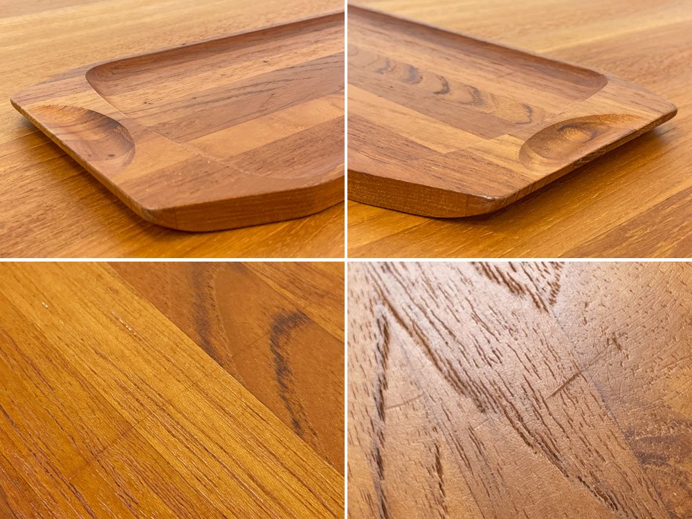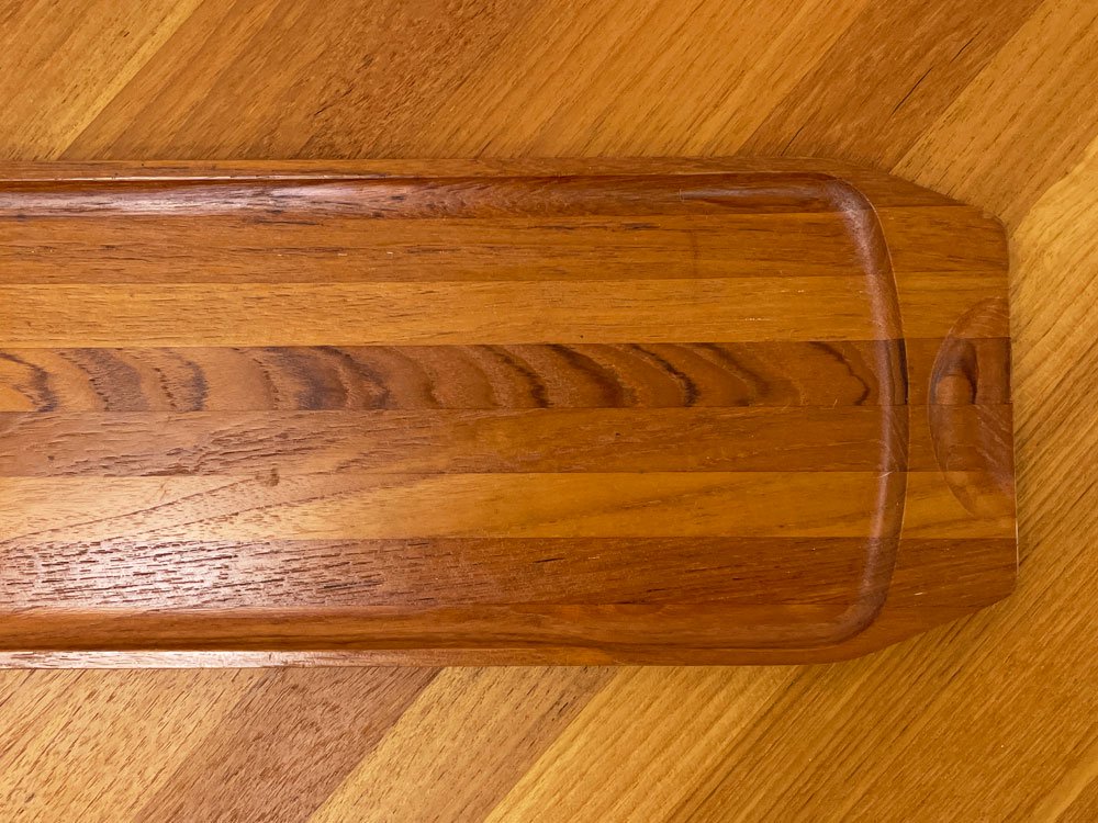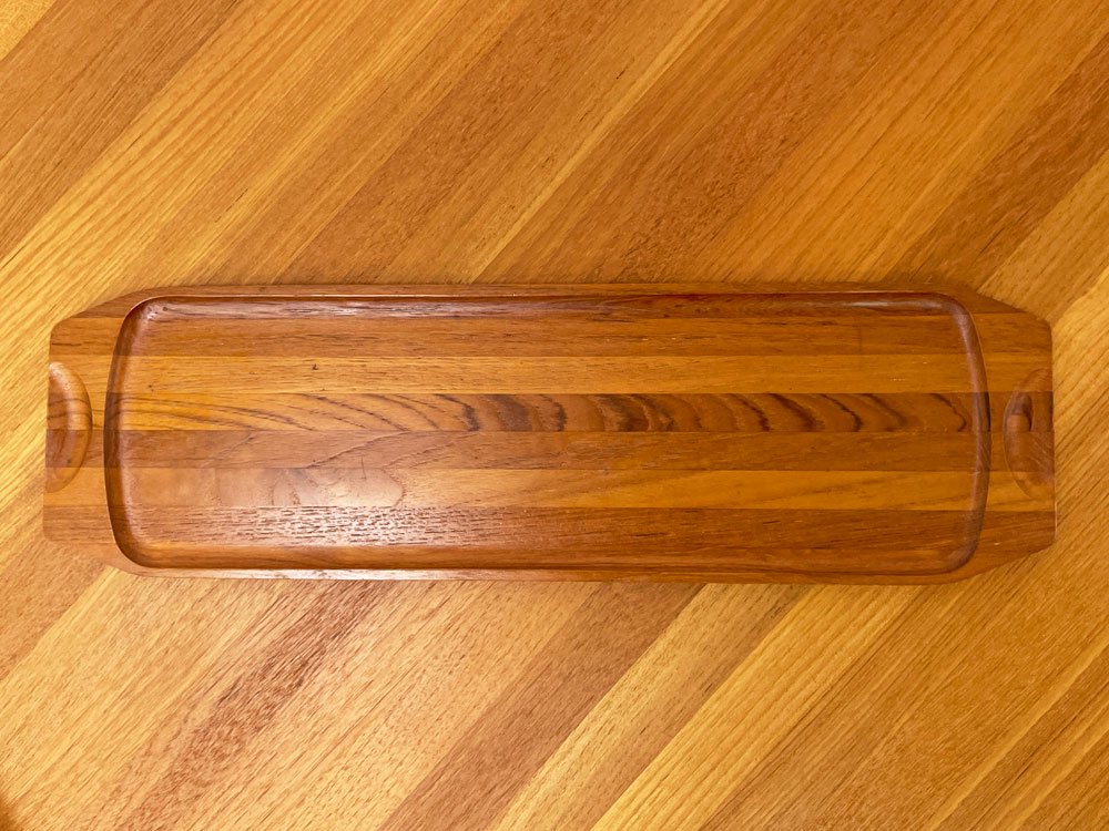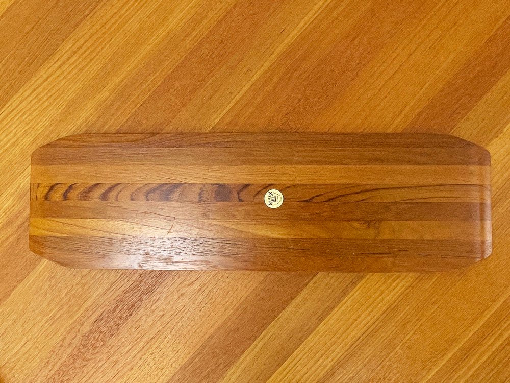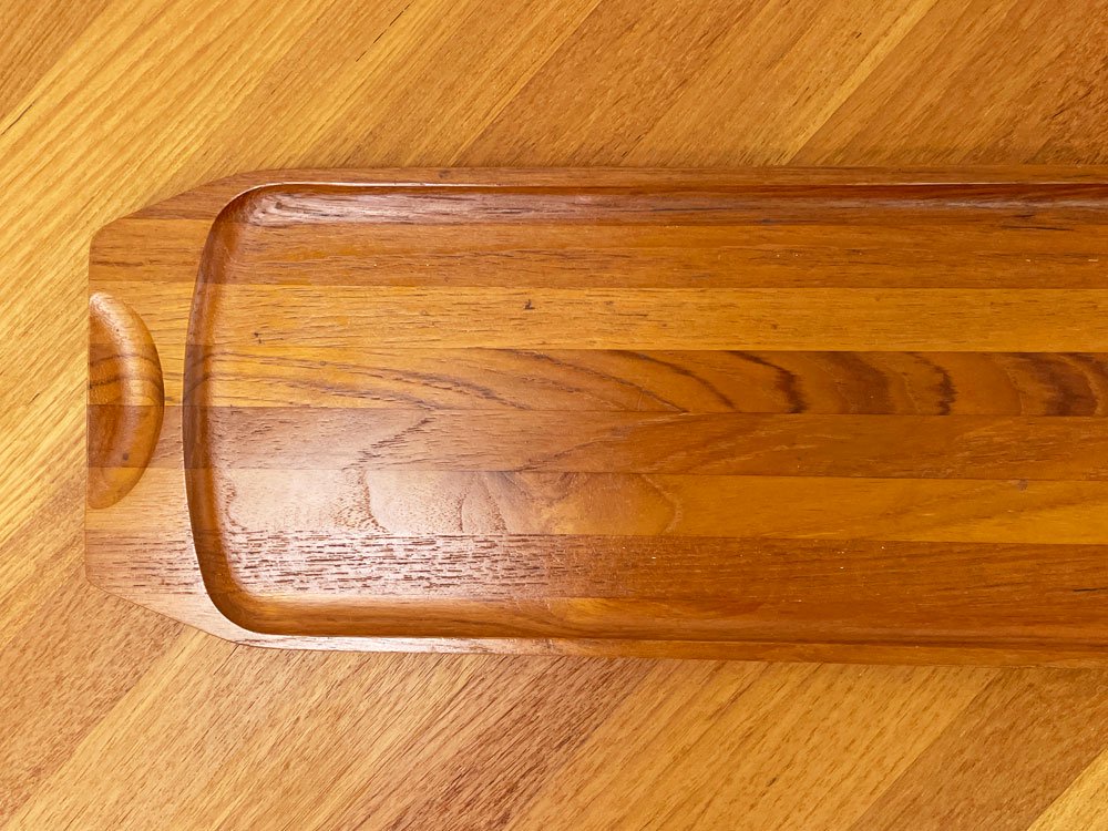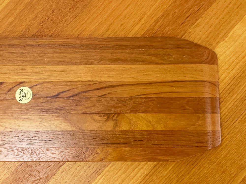 デンマーク" チェニ KJENI "社製のビンテージトレイ。チークの無垢集成材を使用している為、しっかりと厚みがあり、両端には持ち手がくりぬかれています。