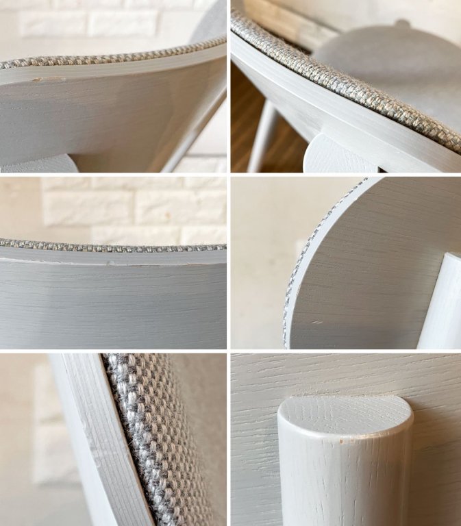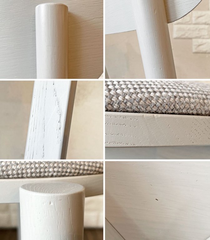 フレームには、擦れや傷、打痕、縁の削れや打ち傷が全体に見受けられるとともに、ファブリックには薄っすらとしたシミがございます。なお、背もたれ上部の背板とファブリックの境目の黄ばみがやや目立ちますが、ご使用に支障となるダメージはございません。これからも安心して実用いただけるコンディションを保っております。