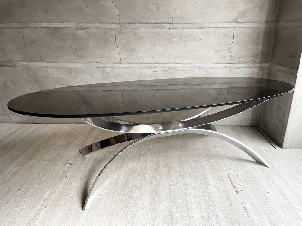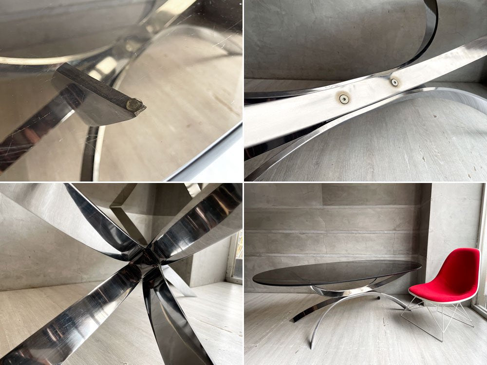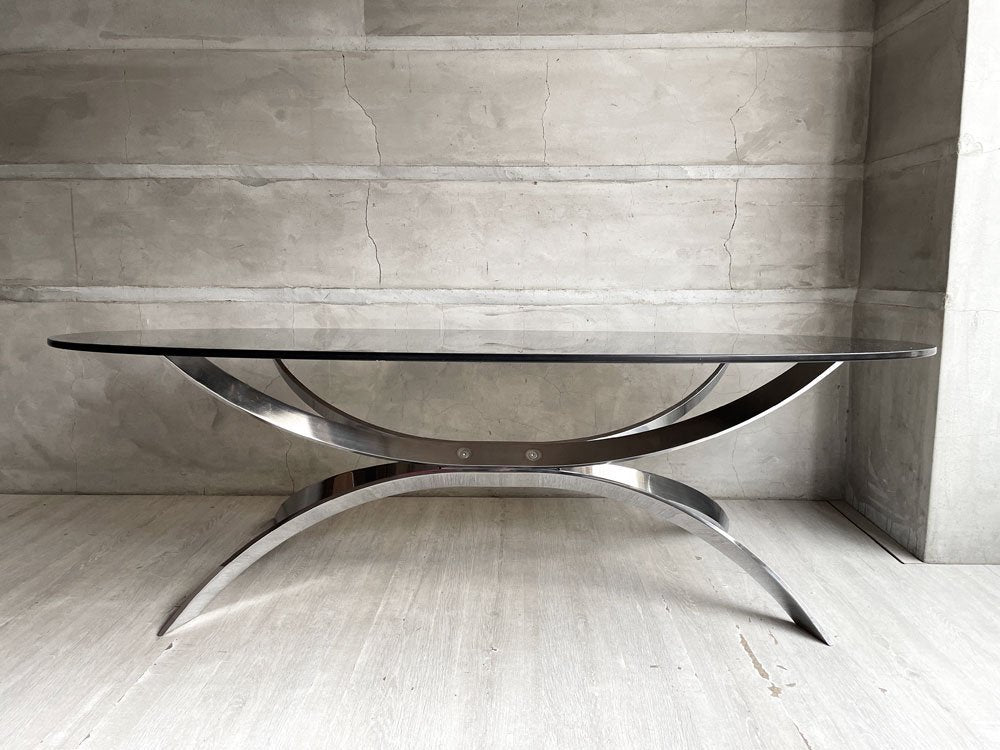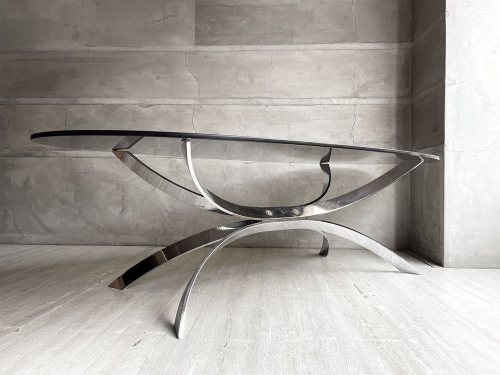 まるで分子構造や細胞のような不思議な造形のアイアンレッグと、オーバル型のスモークガラスが組み合わさった、近代建築を思わせるような独創的な一台。