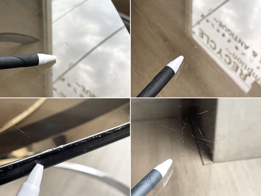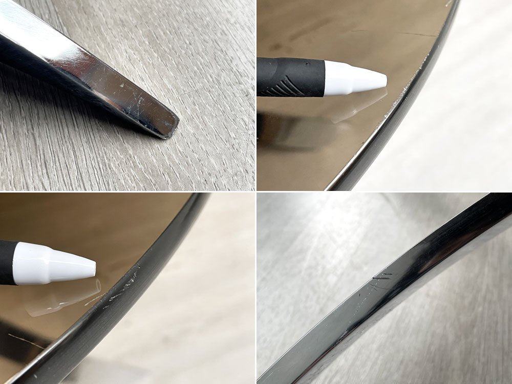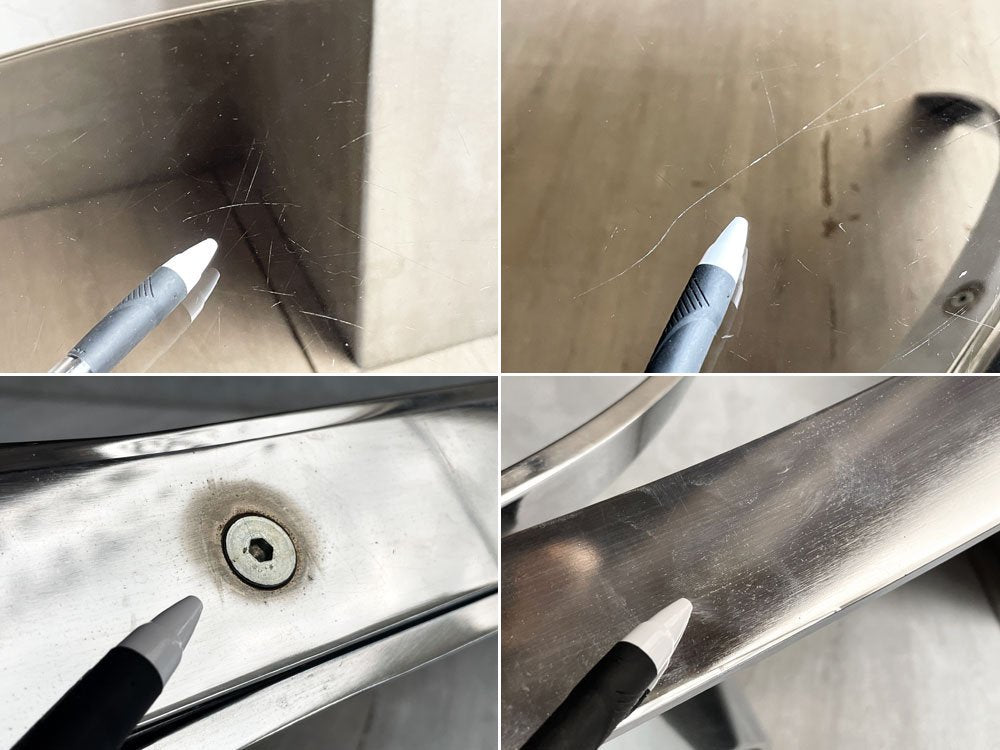 使用に伴い、ガラス天板表面には線傷が散見され、天板縁にも同様に小傷が見受けられます。また脚部には擦れやくすみ、細かな錆が見受けられます。また天板とフレームの間のゴムは接地面の都合上ズレやすくなっておりますが、通常使用には問題ございません。その他ガラスに大きな欠け等は無く、これからも実用頂けるコンディションを保っております。