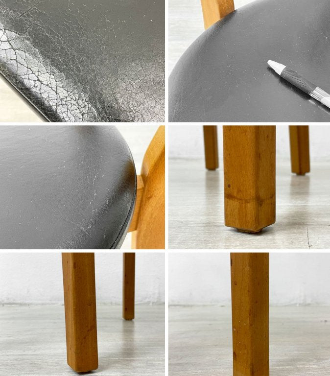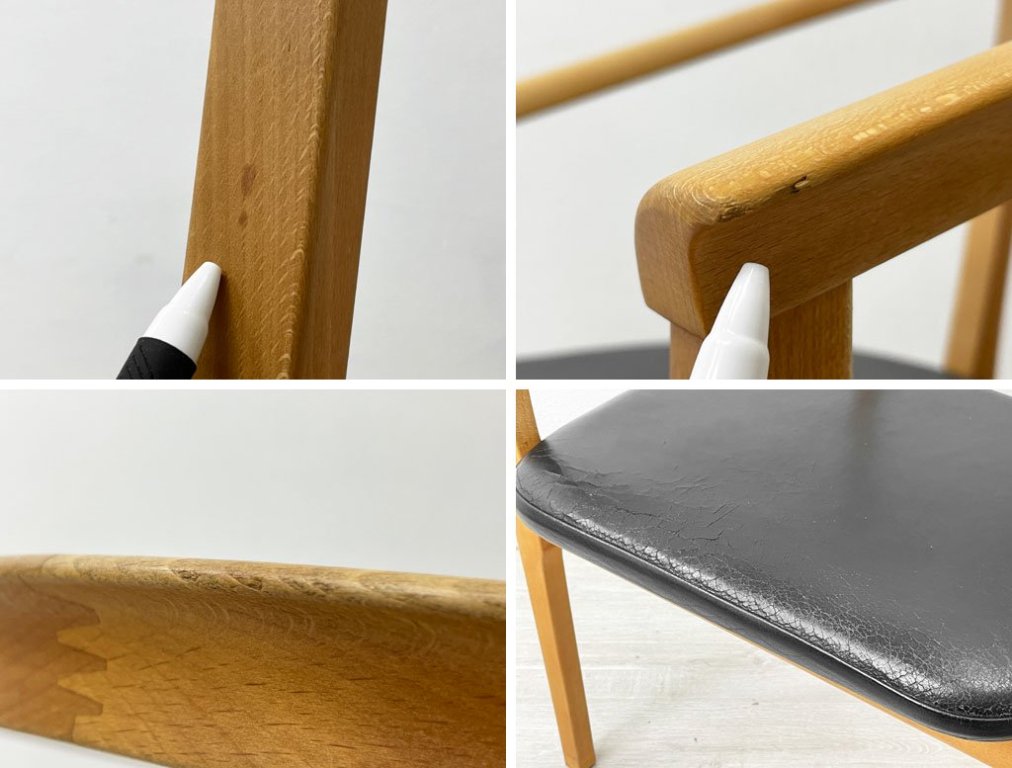 こちらはビンテージ品となります。使用に伴う擦れ傷の他、細かな打痕やいくらかの染み、アーム先端の小さな欠け、アームとそれ以外のフレームに僅かに色合いの差、レザーシートには全体的にクラックや小傷等年月相応の使用感がみられるものの、破れは無くまた大きく風合いを損なうものではございません。ぐらつき等ご使用に問題となるダメージは無く、引き続きデザインを楽しみながらお使い頂けるコンディションを保っております。