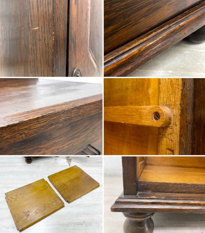 こちらはビンテージのお品物です。天板に割れや歪み、水分を含んだことによる表面のざらつきがございます。また、各所に打痕や線傷、錆等が見受けられますが、いずれもビンテージ家具特有の風合いとしてお楽しみいただける程度のものとなっております。今後も英国ビンテージ家具の雰囲気を愉しみつつ実用いただけるお品物です。