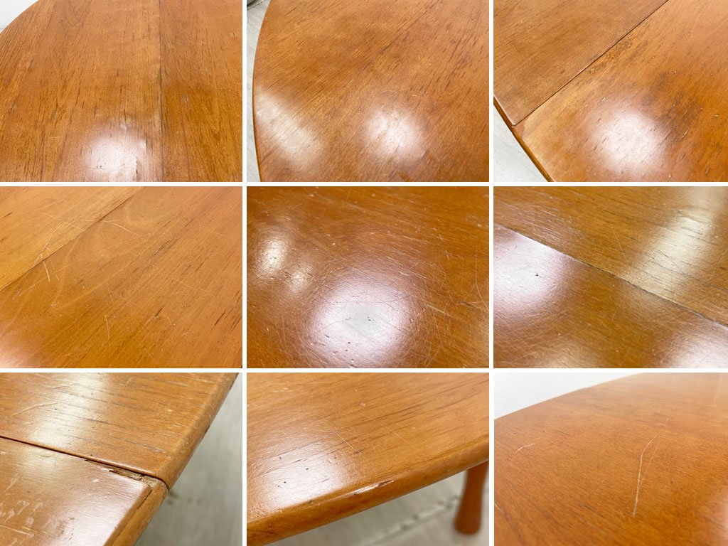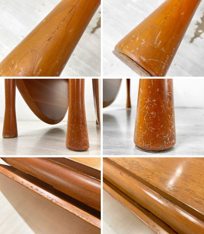 天板に突板の浮きや剥がれ、線傷、擦れ、色合いの変化等が多数見受けられます。また、脚部には一部亀裂があり、経年によるウレタン塗装の劣化も生じております。脚の全体に見受けられる傷のような白い部分はこれにより生じているもので、引っ掻くと剥がれ落ちてくる状態となっております。