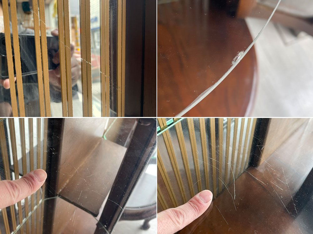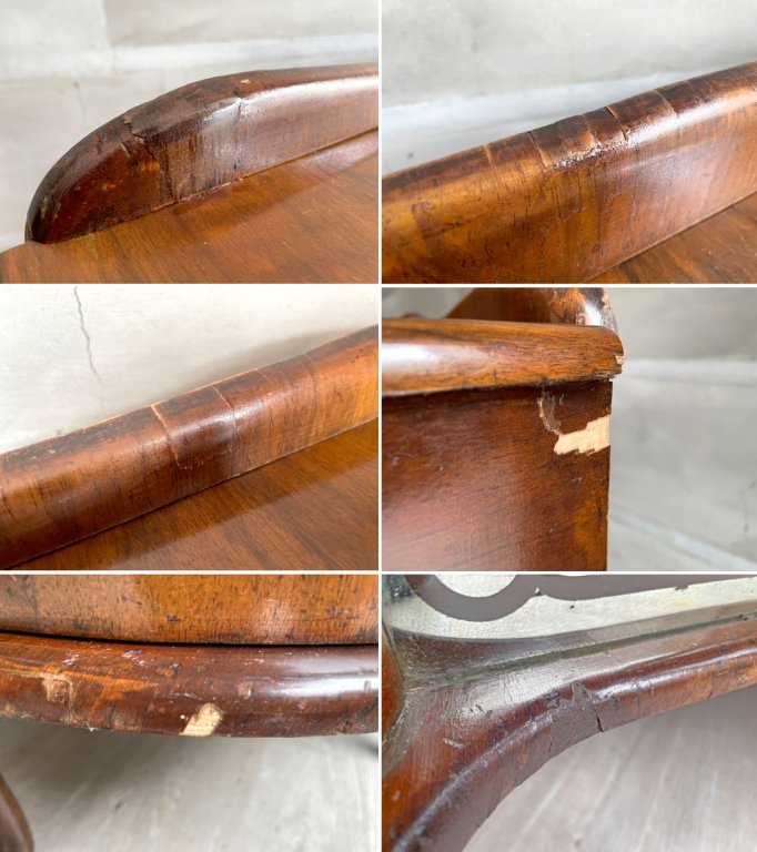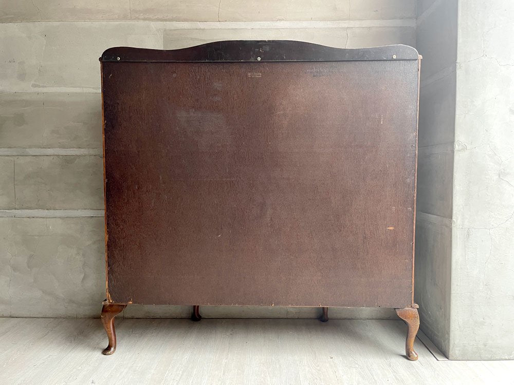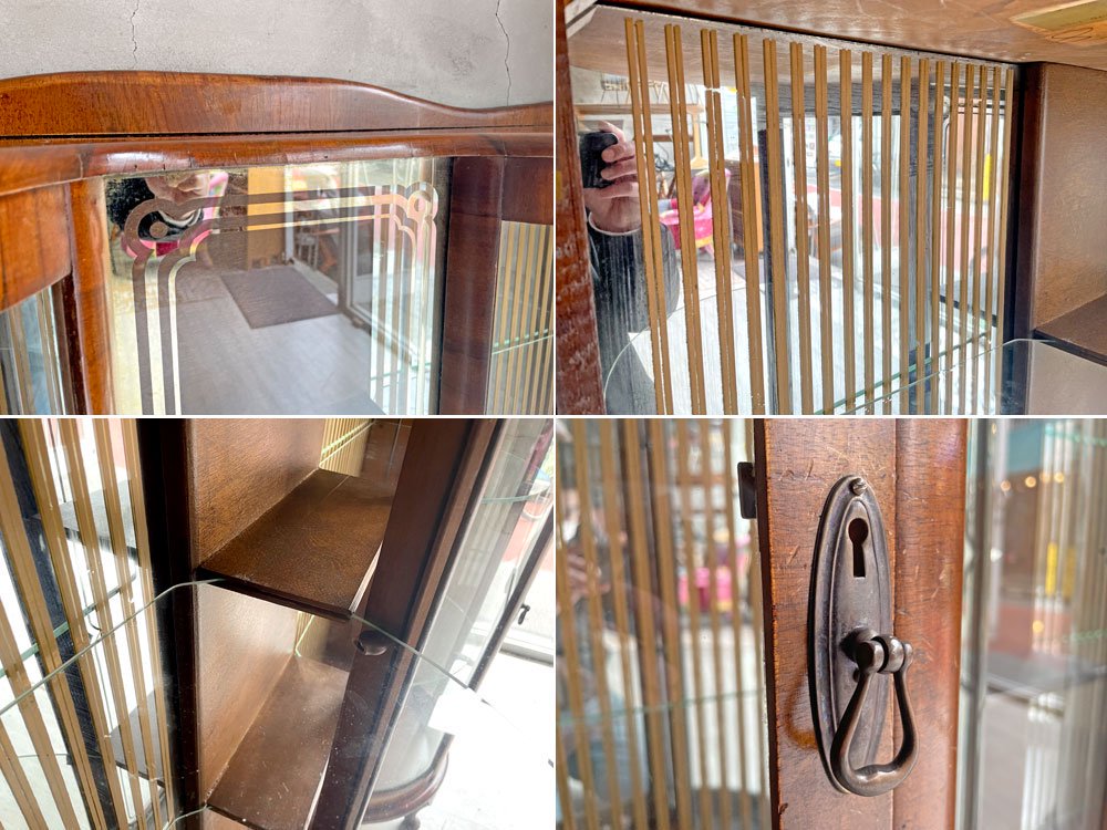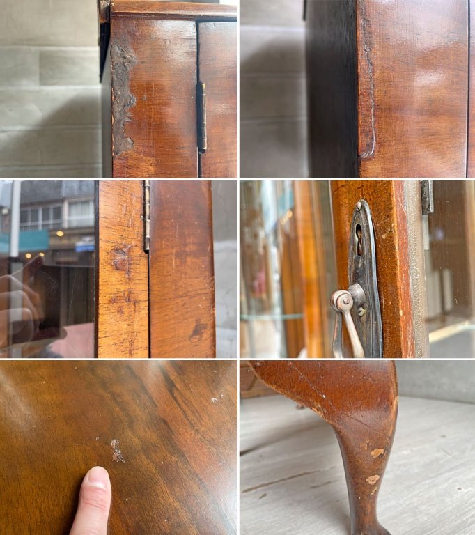 経年に伴う擦れや傷、打痕、ペイントロス、補修痕、突板の剥がれなどが全体的に散見されます。またガラス棚表面のスクラッチ傷やヘアライン、ガラス表面のくすみ、装飾の一部ペイントロスなども見受けられ、使用感の多く見られる個体となりますが、現状ご使用には影響ございません。
