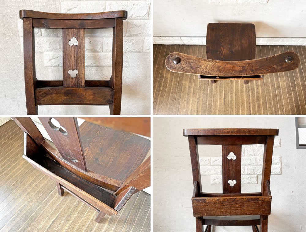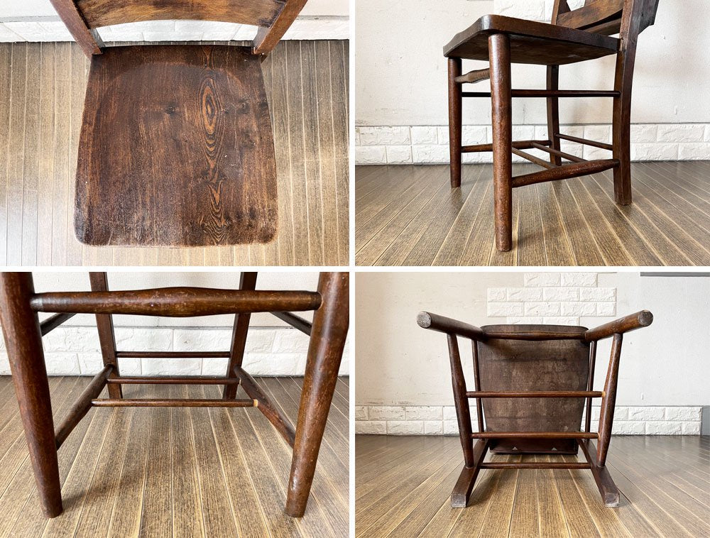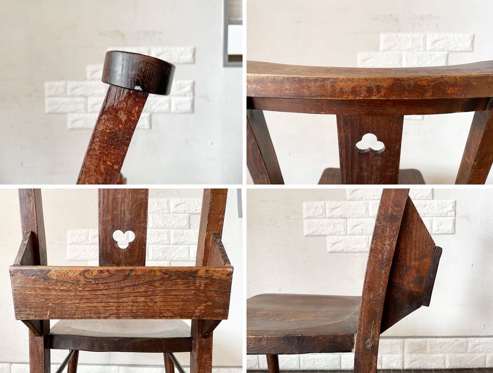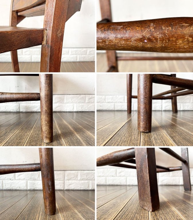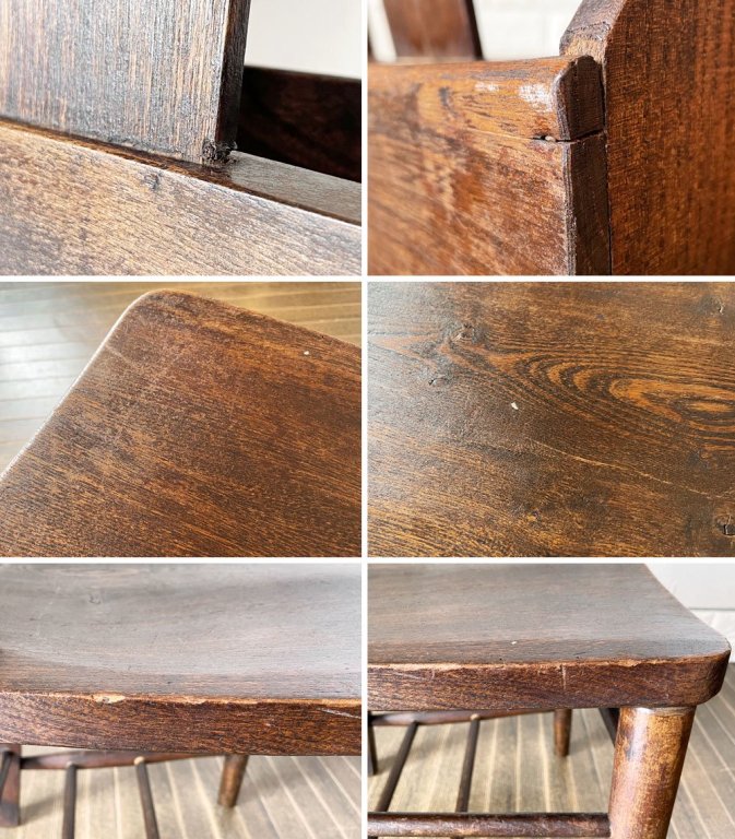 こちらは、ビンテージのお品物です。全体に擦れや傷、木色のムラや剥げ、縁の削れや欠け、黒ずみなどの取り切れない汚れ等が散見されます。また、座面と背もたれフレームの接合部に1箇所、パテ埋めのような補修痕が見受けられますが、着座使用に問題となるぐらつきなどのダメージはございません。経年の風合いをお楽しみいただきながらこれからもまだまだ実用いただけます。