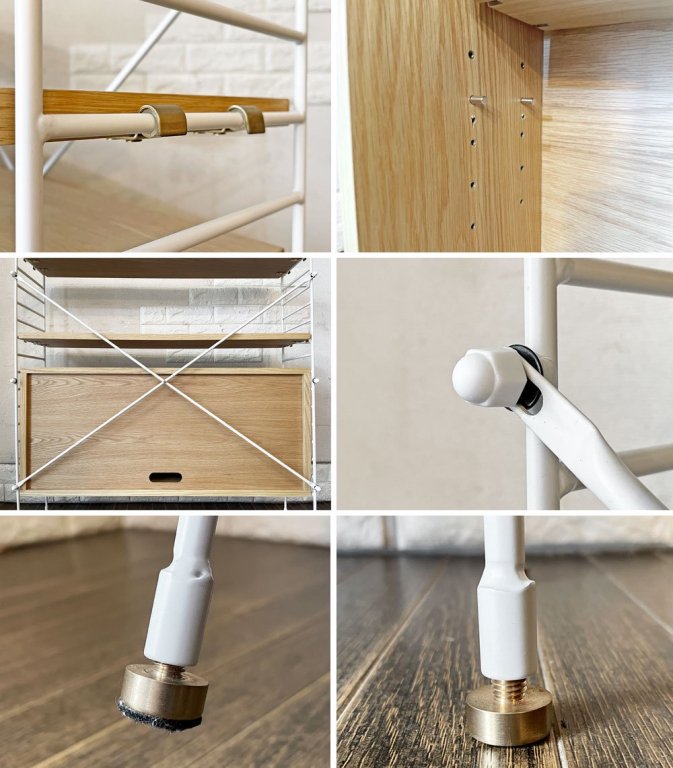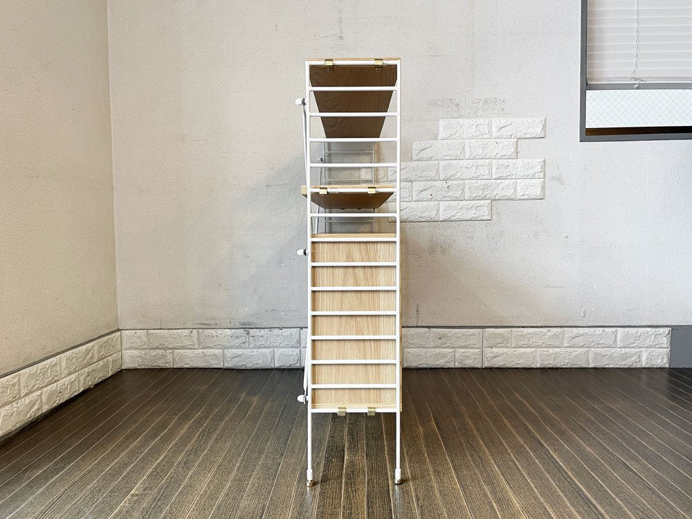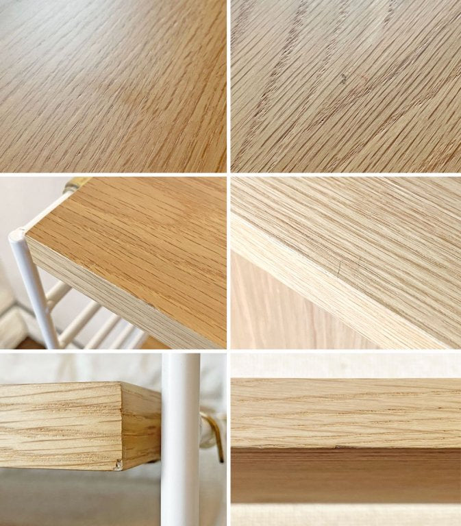 ウッド部分には擦れや傷、縁の削れや欠け、黒ずみなどの取り切れない汚れが見受けられるとともに、フレームにはフックとの接地面を中心にペイントロスや汚れがございます。また、脚底のアジャスターのネジが1本奥まで回り切りません。著しいがたつきは感じられませんが、予めご承知おきくださいませ。その他ご使用に問題となるダメージはなく、これからもまだまだ実用いただけるコンディションを保っております。なお、棚やキャビネットはフックを引っ掛ける仕様となり、固定式ではございません。