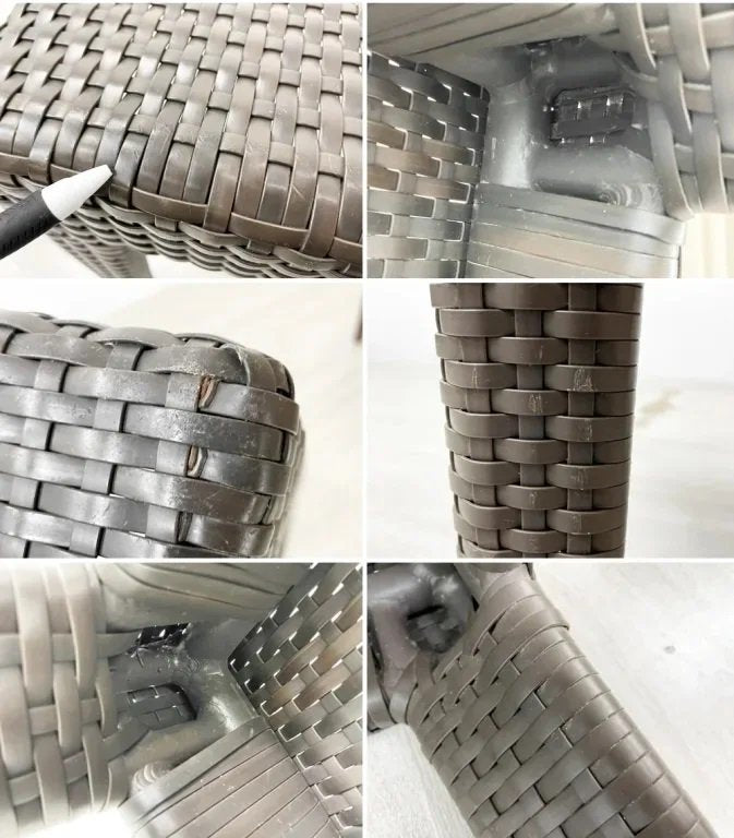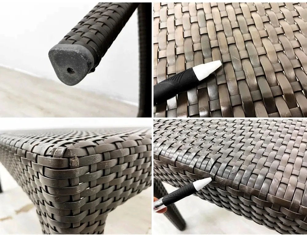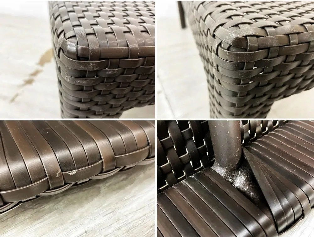 使用に伴い、擦れや傷、打痕、金属部のくすみなど使用感が見受けられます。屋外に設置されていたお品物になりますので、可能な限り清掃は行い、表面は比較的綺麗になりましたが、裏面の樹脂の編み込み箇所や構造上清掃の出来ない内部等に取り切れない汚れや埃、砂等が残っている場合がございます。予めご了承下さい。その他使用上問題となる大きなダメージはございません。これからも実用頂けるコンディションを保っております。