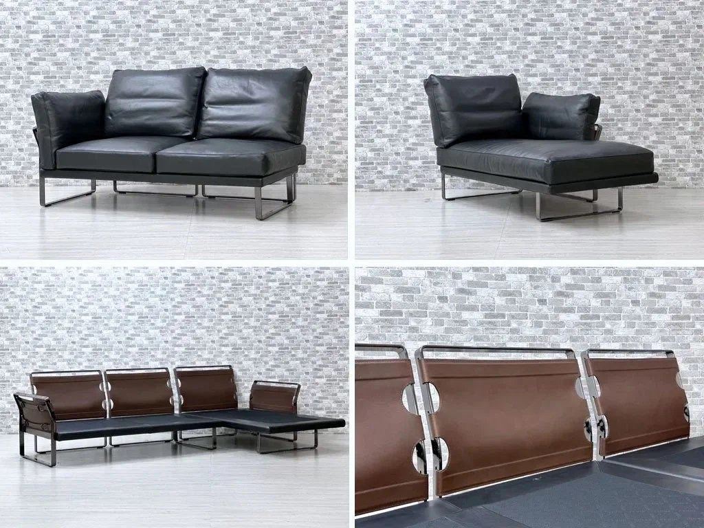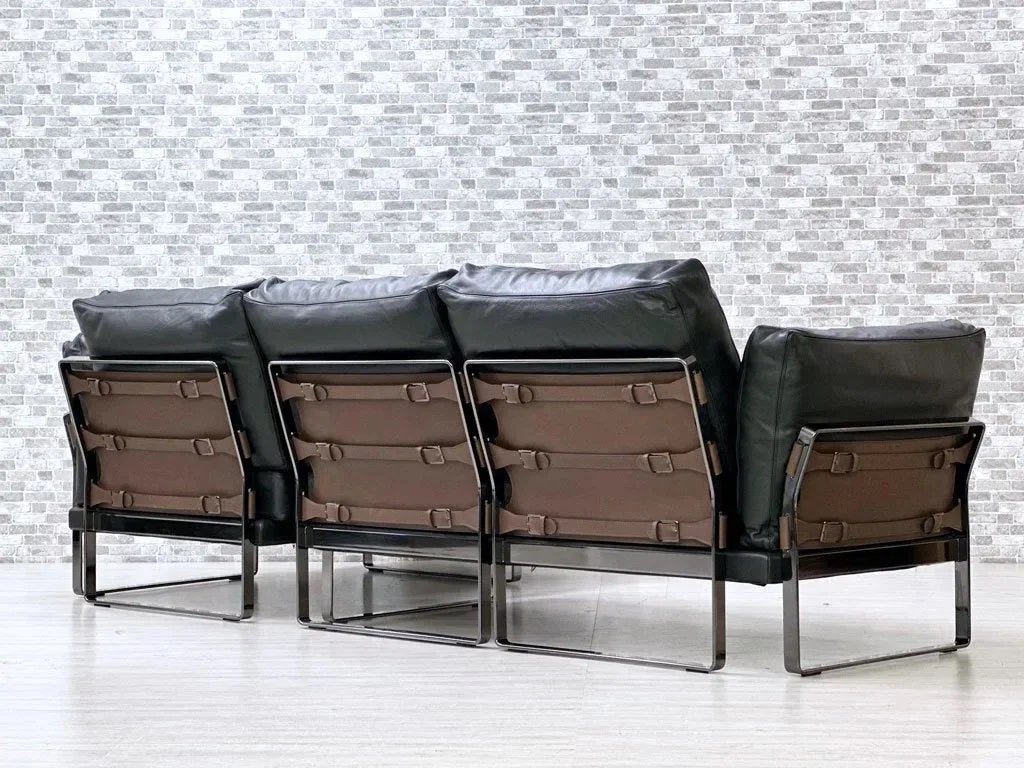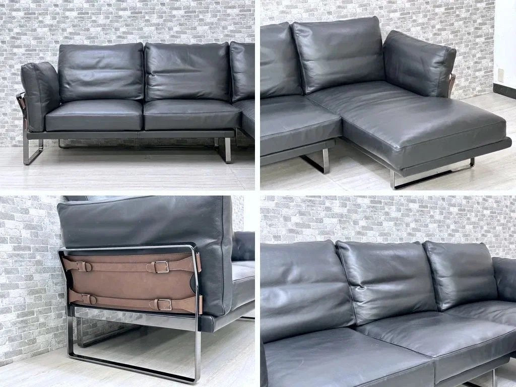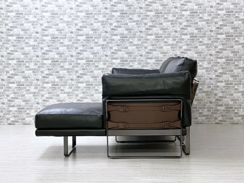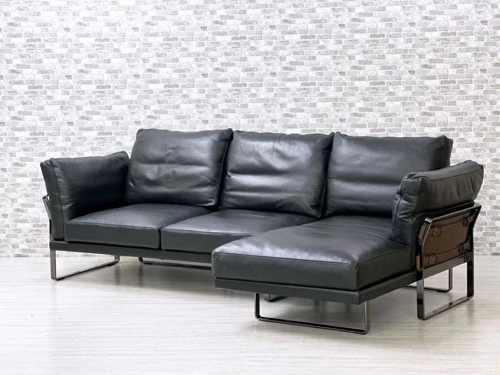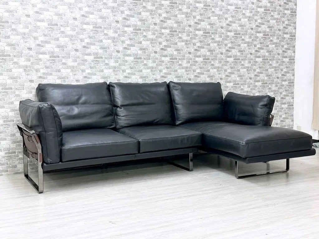 ブラック色の高級本革を使用したフェザークッションによる重厚感溢れる造り。フレームには光沢のあるダーククロムメタルを使用し、統一感のある色合いと無機質な金属素材によるメリハリを加えています。背面やアーム側面にはブラウン色の本革を使用し、ベルトで留められた目を惹くデザインとなっております。