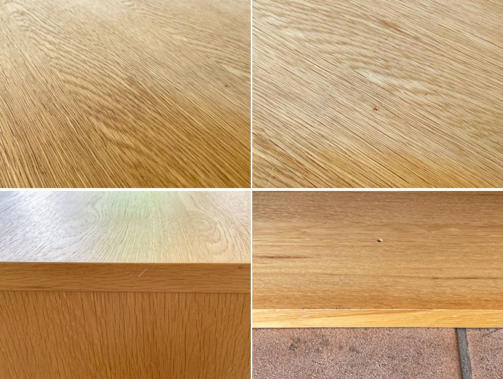 使用に伴い、軽い線キズや僅かな打痕が御座います。また天板に日焼けによる色褪せ、取り切れない染みや汚れが御座いますがどれも美観を損ねるものでは御座いません。全体として綺麗な状態を保っており、これからも気持ちよくお使い頂けるコンディションとなっております。