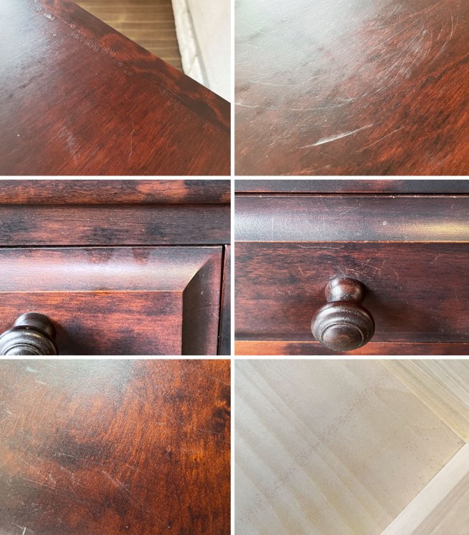 使用に伴う、擦れや傷、縁の削れが散見されるとともに、全体に木肌のくすみや白化がございます。その他、天板や棚板には多数の線傷や打痕、抽斗内部のシミ汚れ等はございますが、ご使用に問題となるダメージはございません。今後もまだまだ実用頂けるコンディションを保っております。
