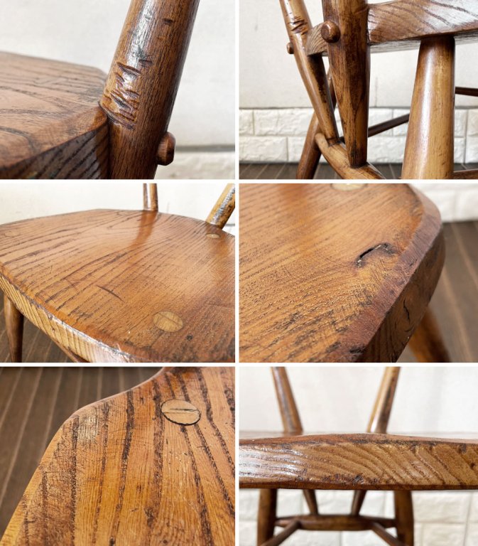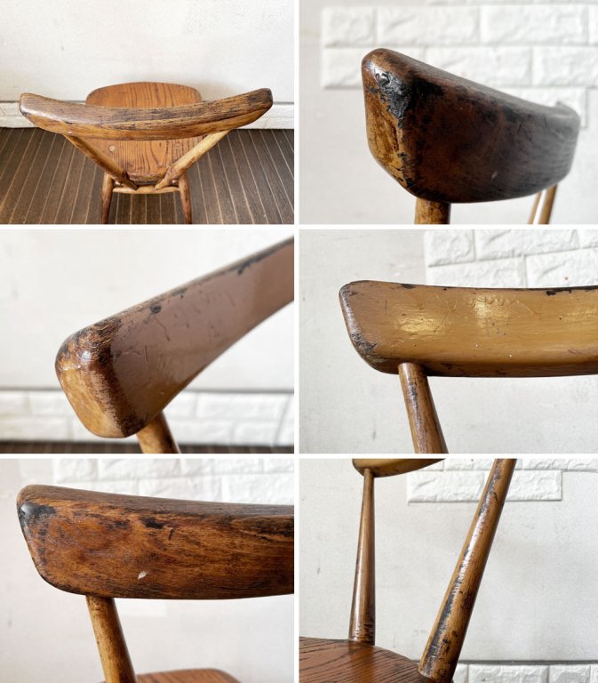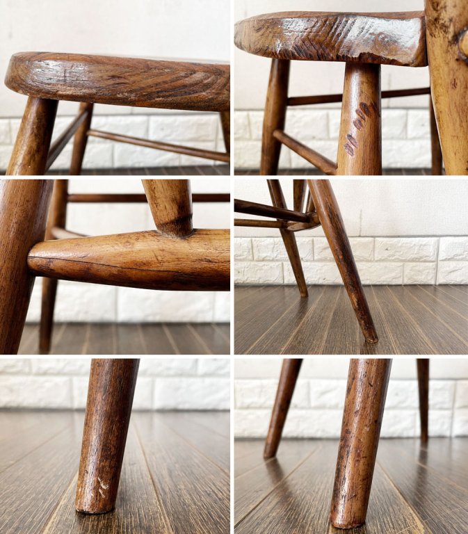 こちらは、ビンテージのお品物です。使用や経年に伴う擦れや傷、黒ずみや木色のムラ、取り切れない汚れ等が全体に見受けられます。また、一部打ち傷が目立つ箇所や木部の亀裂がございます。その他、メーカーシールの剥がれた痕などはございますが、ご使用に問題となるダメージはございません。これからも風合いをお楽しみいただきながら実用頂けます。