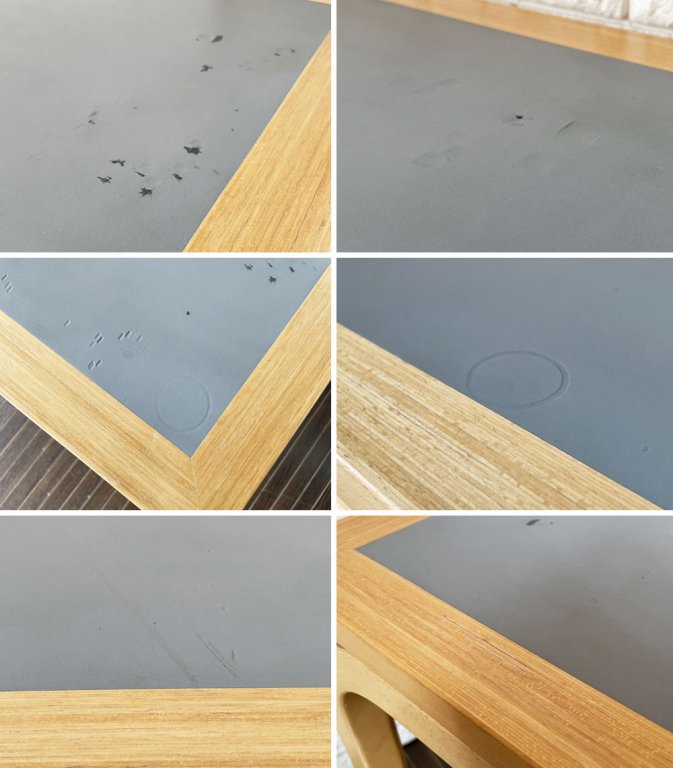 なお、向かって右前脚部は接着箇所が天板のみとなり、若干の傾きやぐらつきがございます。現状実使用は問題なく行えますが、構造上横揺れに弱いため特に家具を移動させる際は十分お注意くださいませ。多少の使用感はございますが、経年の風合いとしてお楽しみいただきながらこれからも実用頂けます。
