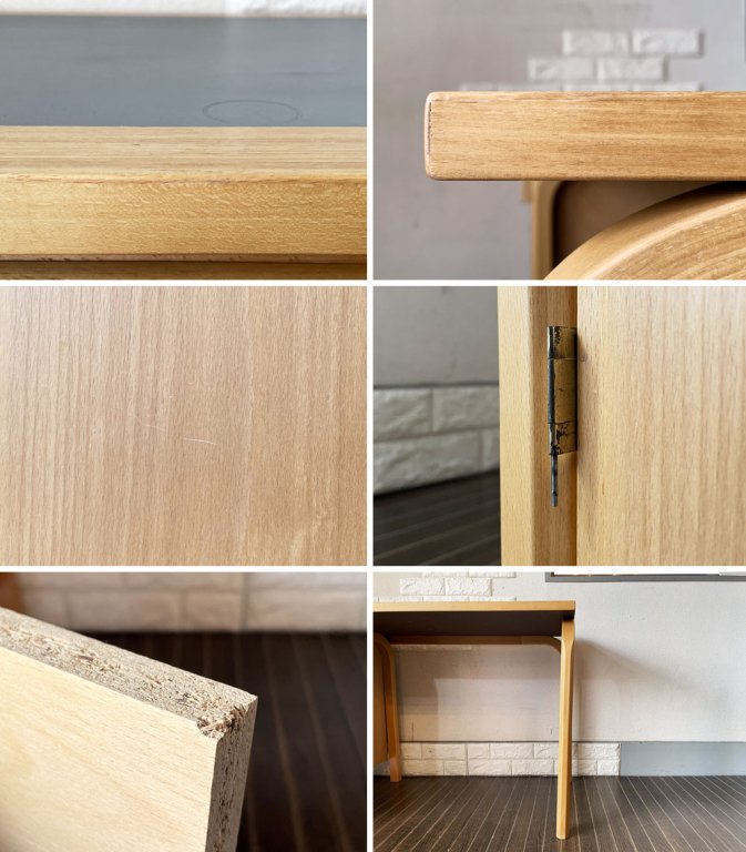 こちらは、ビンテージのお品物です。リノリウム天板には黒ずみやシミなどの取り切れない汚れや打痕、圧着痕、線傷がやや目立ちます。また、使用に伴う擦れや傷、縁の削れ等が全体に見受けられるとともに、扉の丁番の細い棒状の金具が1箇所飛び出ています。