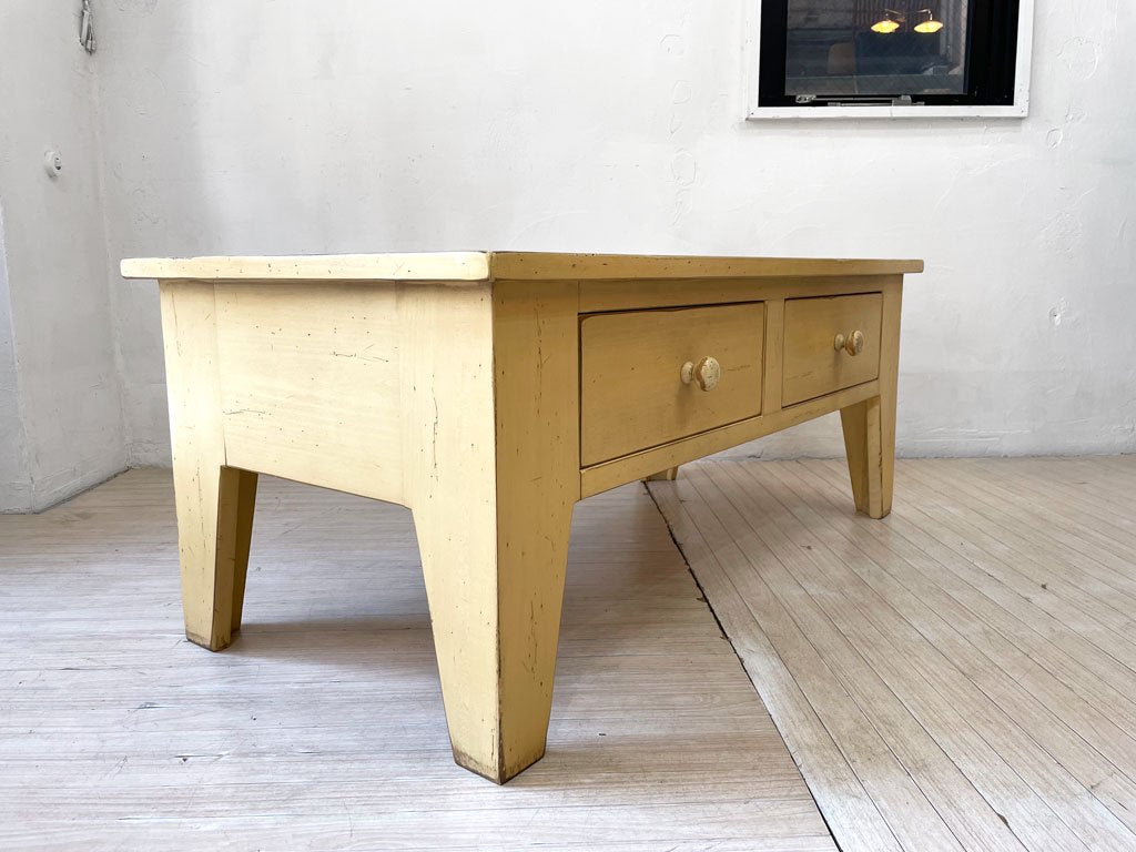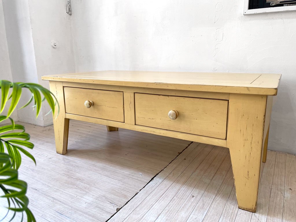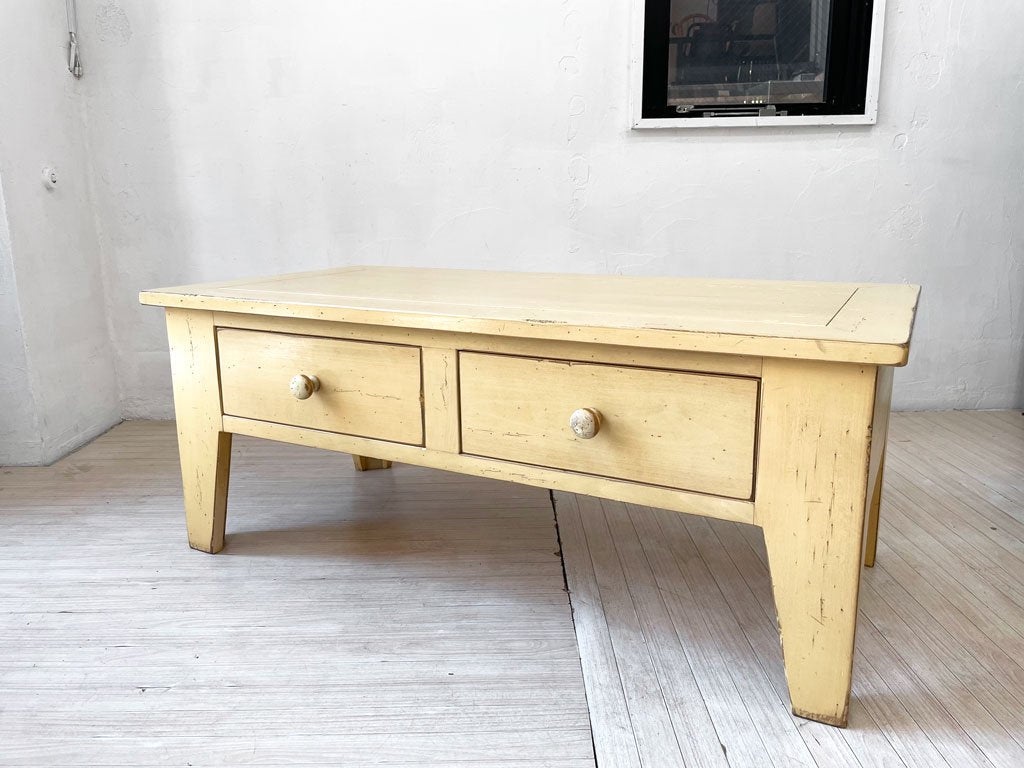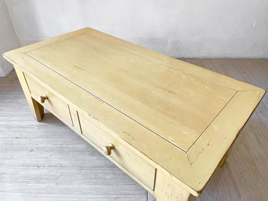 UKビンテージ ペインテッド ローテーブル センターテーブル コーヒーテーブル クリーム色 パイン無垢材 2ドロワー シャビーシック 英国カントリー 店舗什器 ★