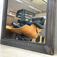 しっかりとした重量がある本格的なミラーとなりますので、通常使用としては立て掛けをおすすめ致しますが、背面に壁掛け用の金具も装備しておりますので、確りとした壁面に対してはウォールミラーとしてもお使い頂けます。