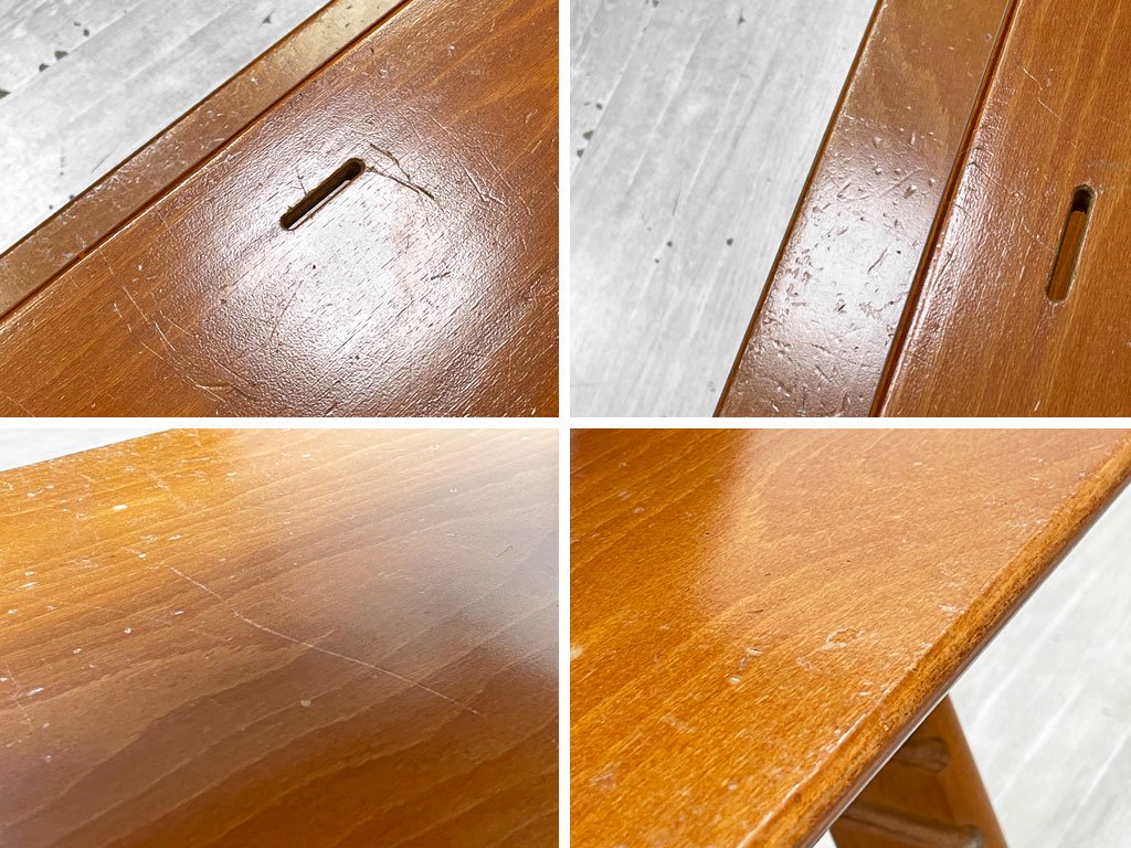 座板・足のせ板に、使用による表面の塗装剥がれ、線傷、打痕などが多数見受けられます。また、脚部には取り切れない汚れ、ネジ穴にくすみや錆びなど、使用感のあるコンディションではあるものの、実用に問題となるような不具合はございません。今後も十分実用頂けるコンディションを保っております。