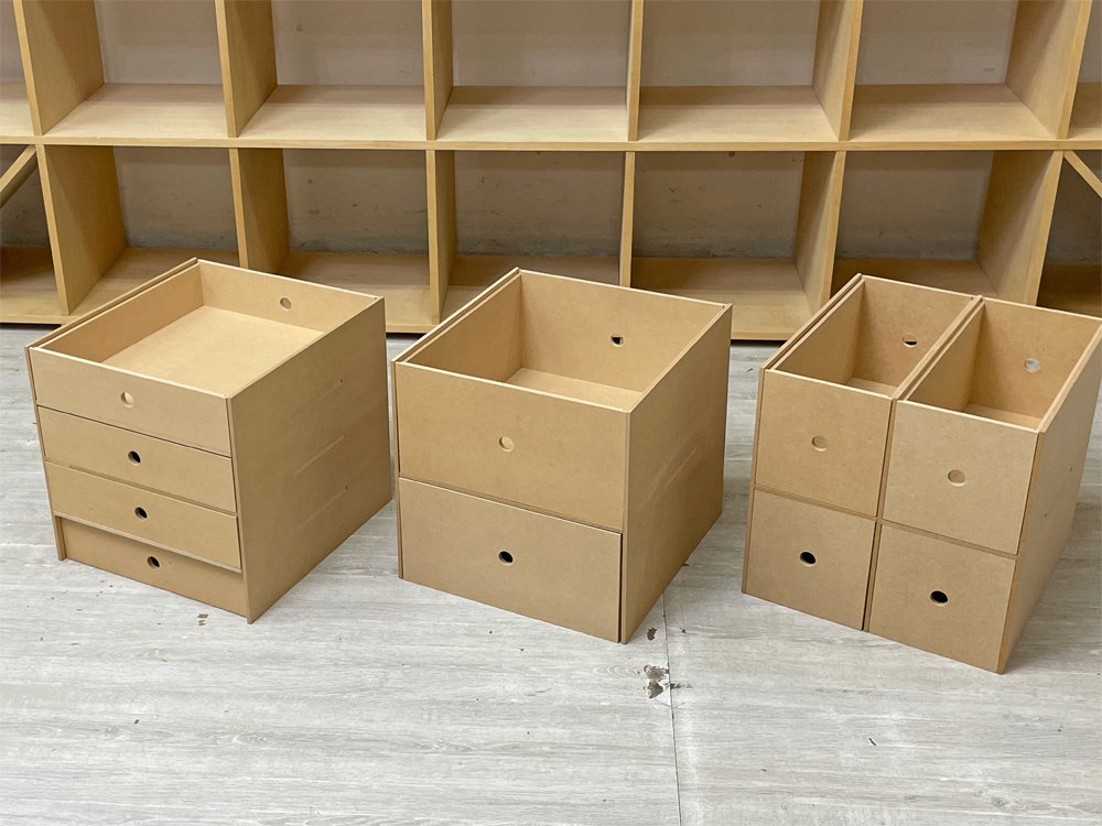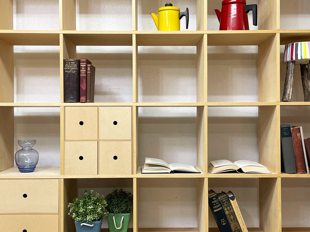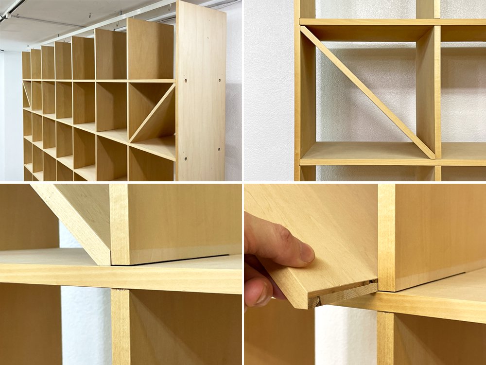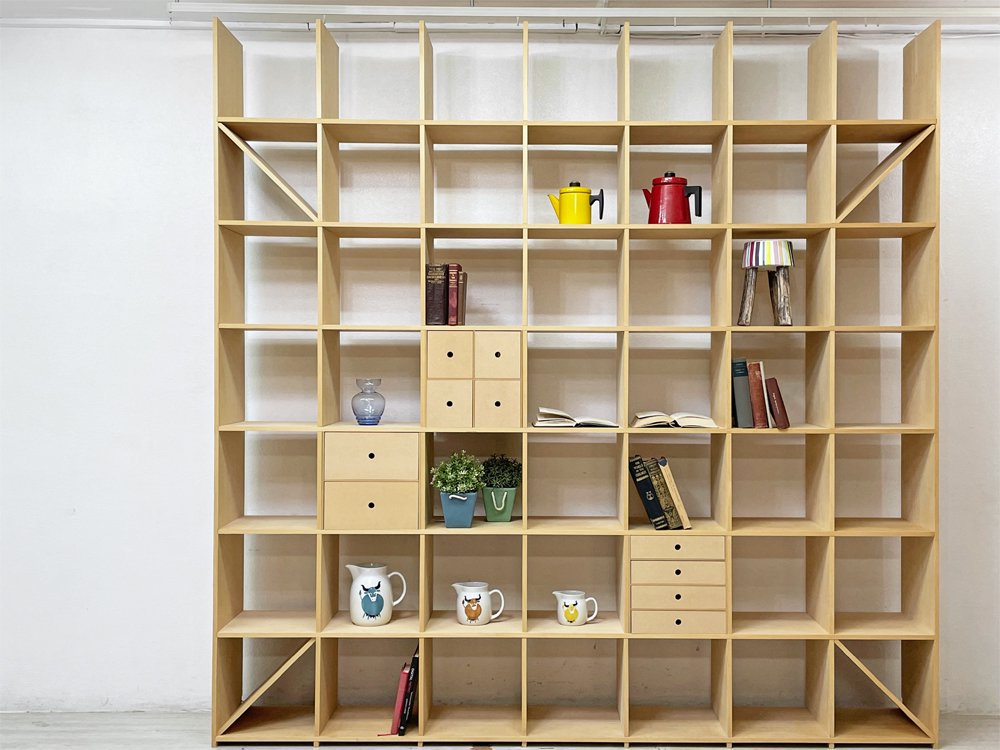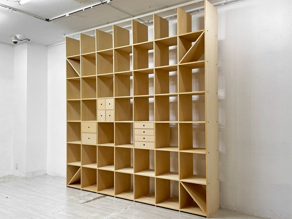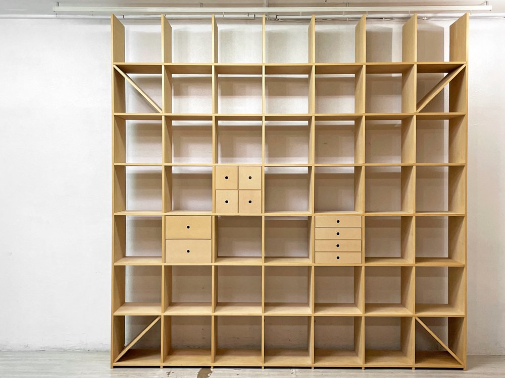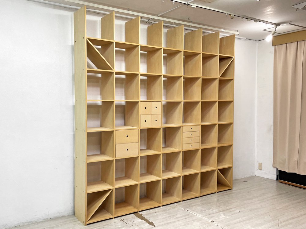 マルゲリータ margherita 壁一面の本棚 縦7コマ横7コマ オープンシェルフ 書棚 シナ材 無塗装 壁面収納 店舗什器 ミニマル 引き出し付 定価総額¥209,110- ●