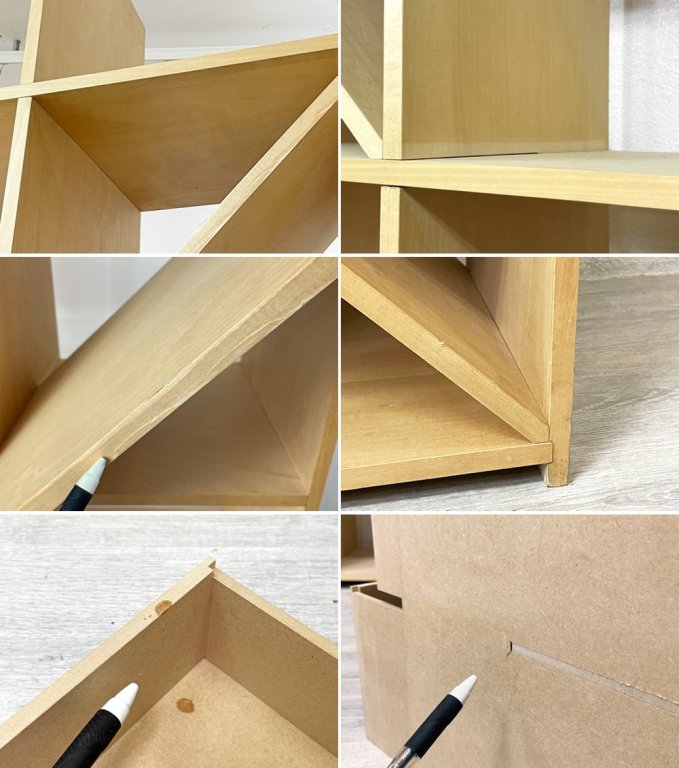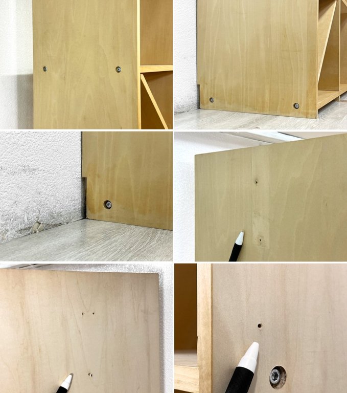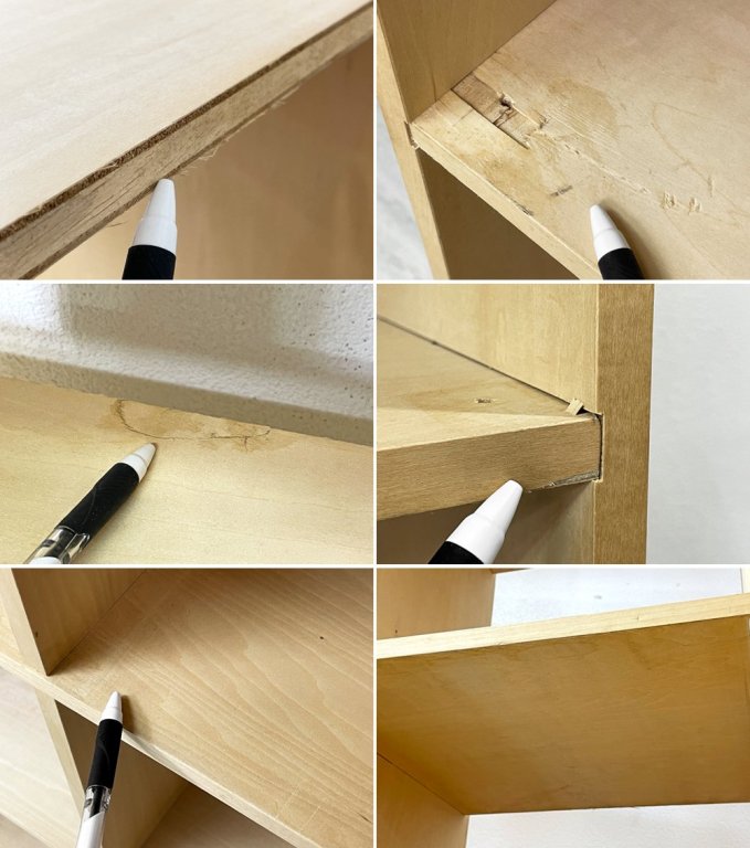 使用に伴う擦れ傷の他、スクラッチ、線傷、打痕、うっすらとした黒ずみや、ヤケ、染み、突板の剥がれ、背面側のささくれ、全体的に小さなビス穴がいくらか見られる等やや使用感はございますが、いずれも大きく目立つものではございません。