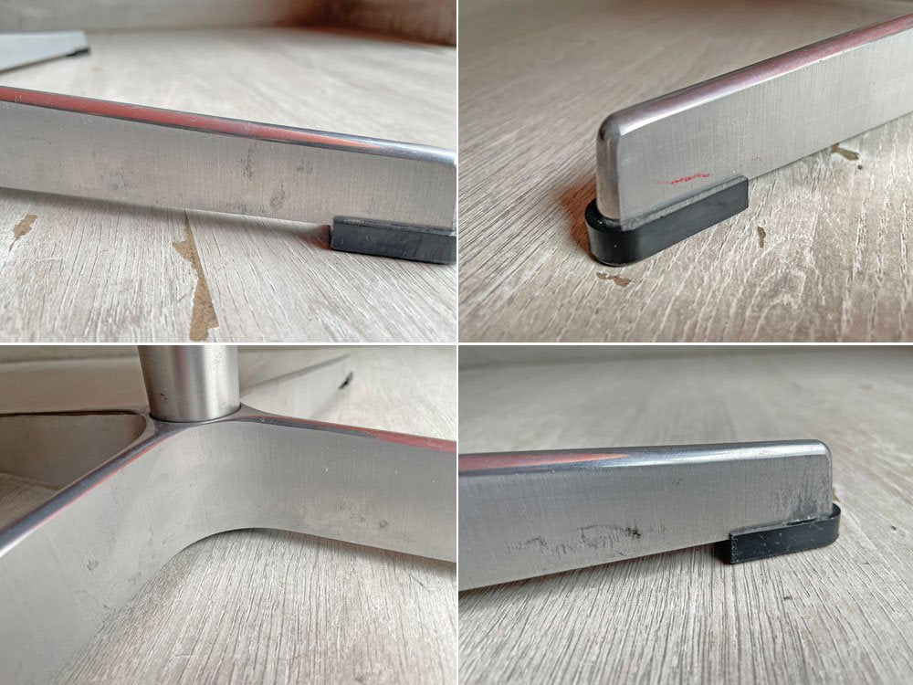 チェアの座面奥に黒っぽい薄染み、オットマンの中央に色褪せ、縁に薄染みが見られます。また、全体的に若干の色褪せが感じられるほか、脚部にくすみや色移りが見られますが、極端に美観を損なうほどではございません。