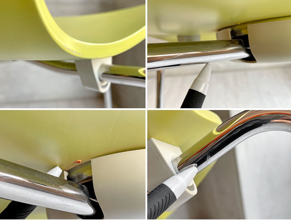 使用に伴い、擦れや打痕、それらによるペイントロスが見受けられます。また脚部には若干の錆やくすみがございますが大きく目立つものではございません。その他グラつき等大きなダメージ無く、これからも実用頂けるコンディションを保っております。