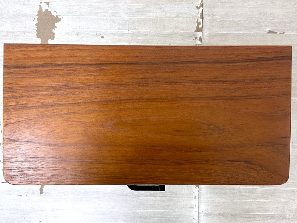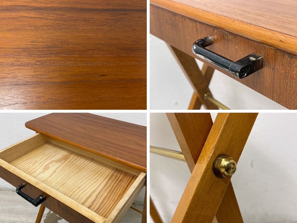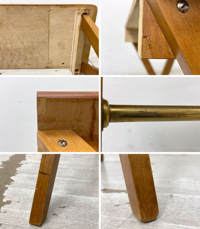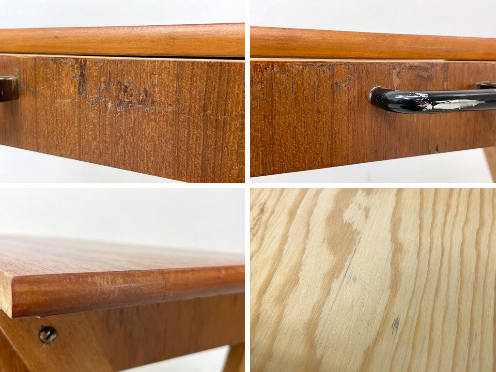 こちらはビンテージのお品物です。使用に伴う擦れや傷、僅かな打痕や色ムラが見受けられます。金属フレーム部分にはくすみや若干の錆が散見されます。また、引き出し前面の全体と天板裏に大小2箇所、突板の剥がれとそれに伴う補修痕がございます。