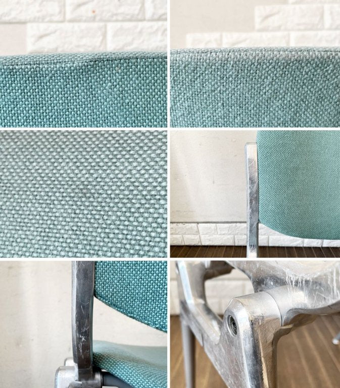 こちらは、ビンテージのお品物です。ファブリックには全体に薄っすらとした黄ばみや毛羽立ち、シワ、若干の色褪せ、一部シミ汚れが見受けられます。また、内部クッションには経年による劣化が生じており、手で触るとやや凸凹とした箇所がございますが着座時にはさほど気になりません。その他、脚部には擦れやガリ傷、僅かな錆、取り切れない汚れ等がございますが、ご使用に問題となるがたつきやぐらつきなどの大きなダメージはございません。今後も安心して実用いただけるコンディションを保っております。
