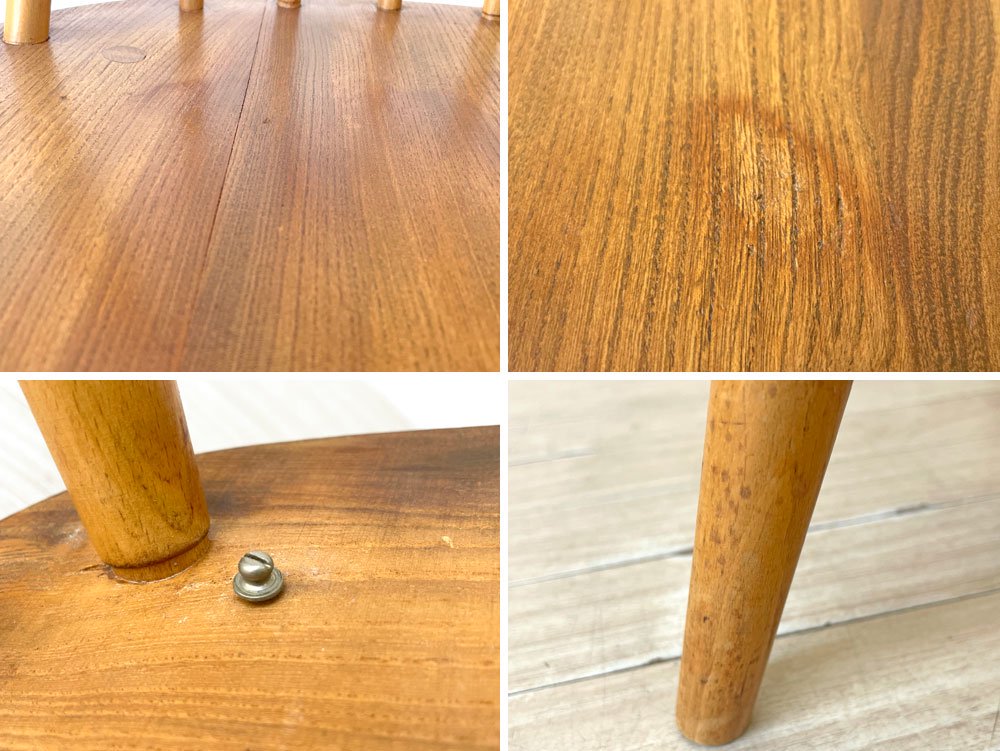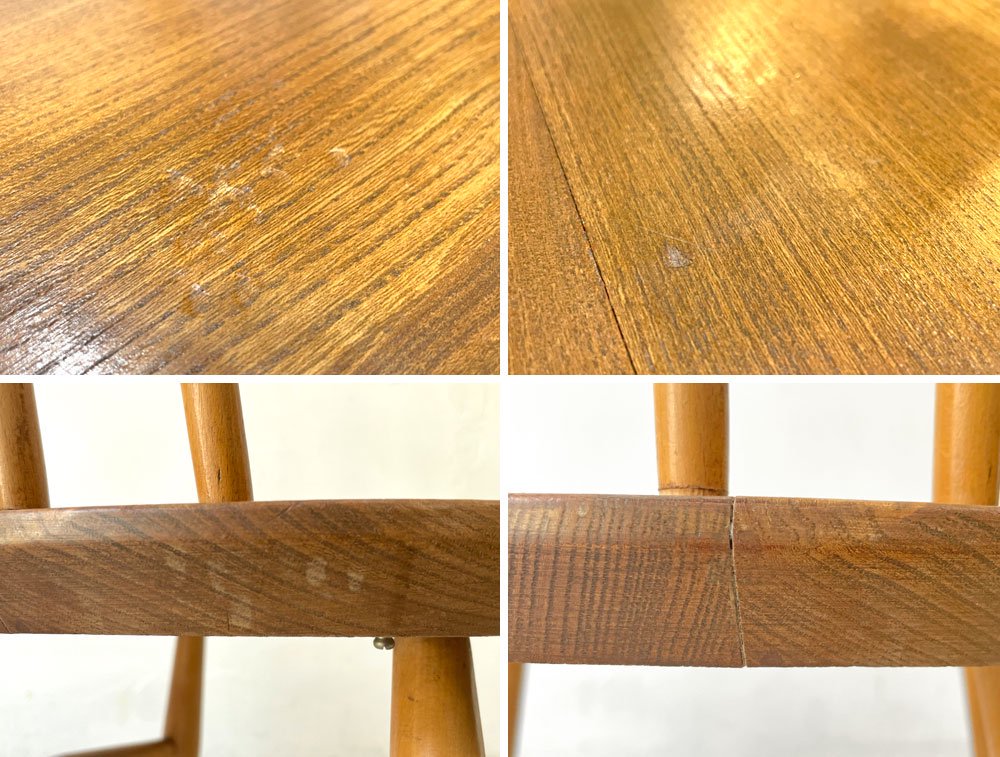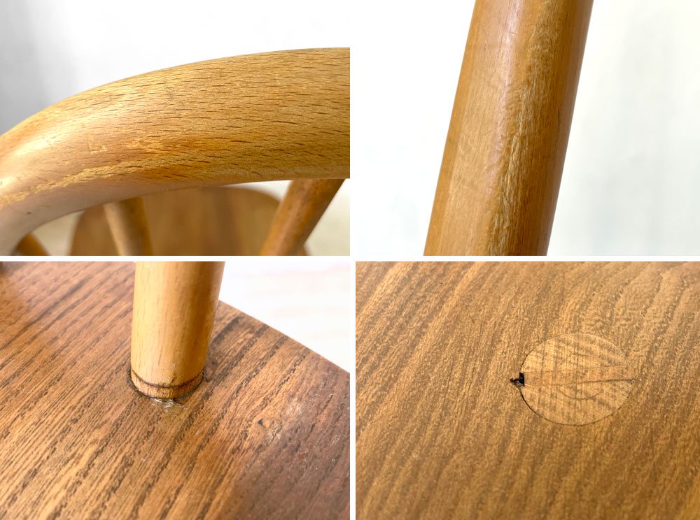 こちらはビンテージのお品物です。使用・経年に伴う傷や擦れ、打痕やペイントロス、色ムラや塗装剥げなどがございます。また座面に大きな割れの補修痕がございますが、実用強度に問題はございません。ビンテージ品となり経年なりの使用感はございますが、美観や機能を損なうような大きなダメージは見られず、ビンテージの風合いを楽しみながらお使いいただけるコンディションを保っております。