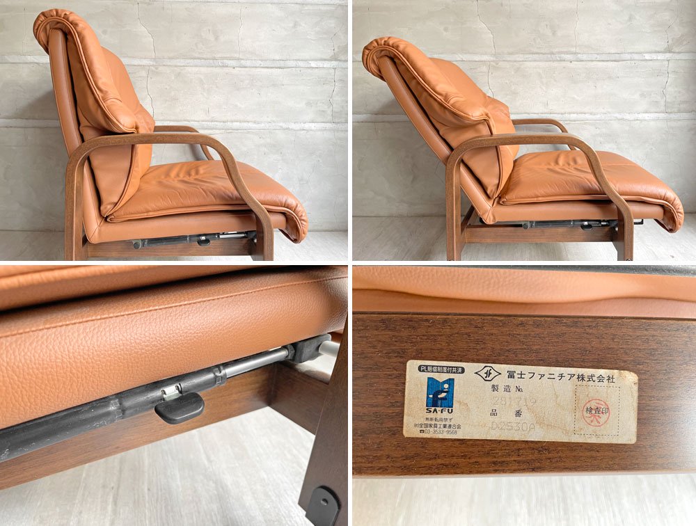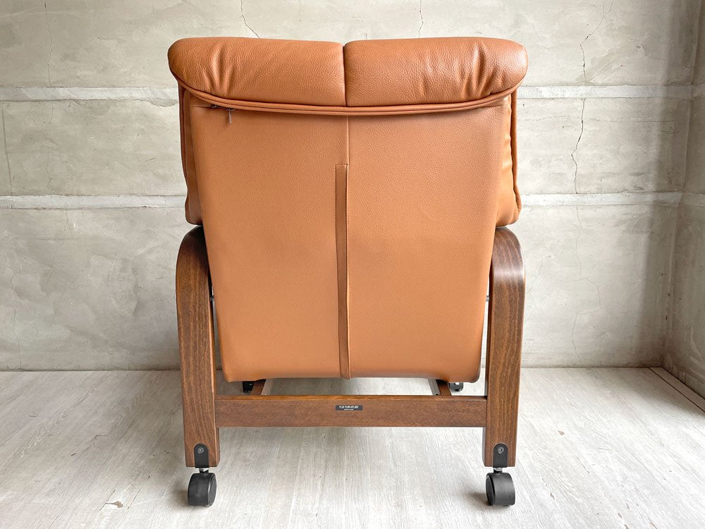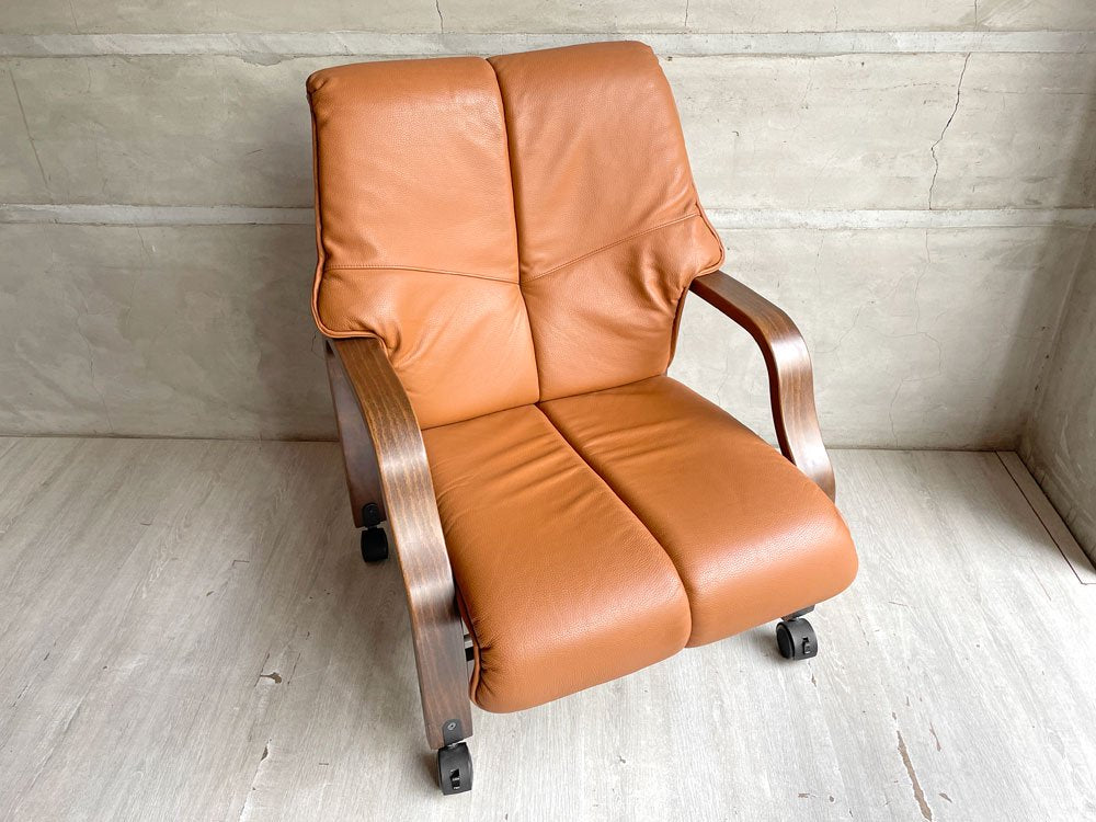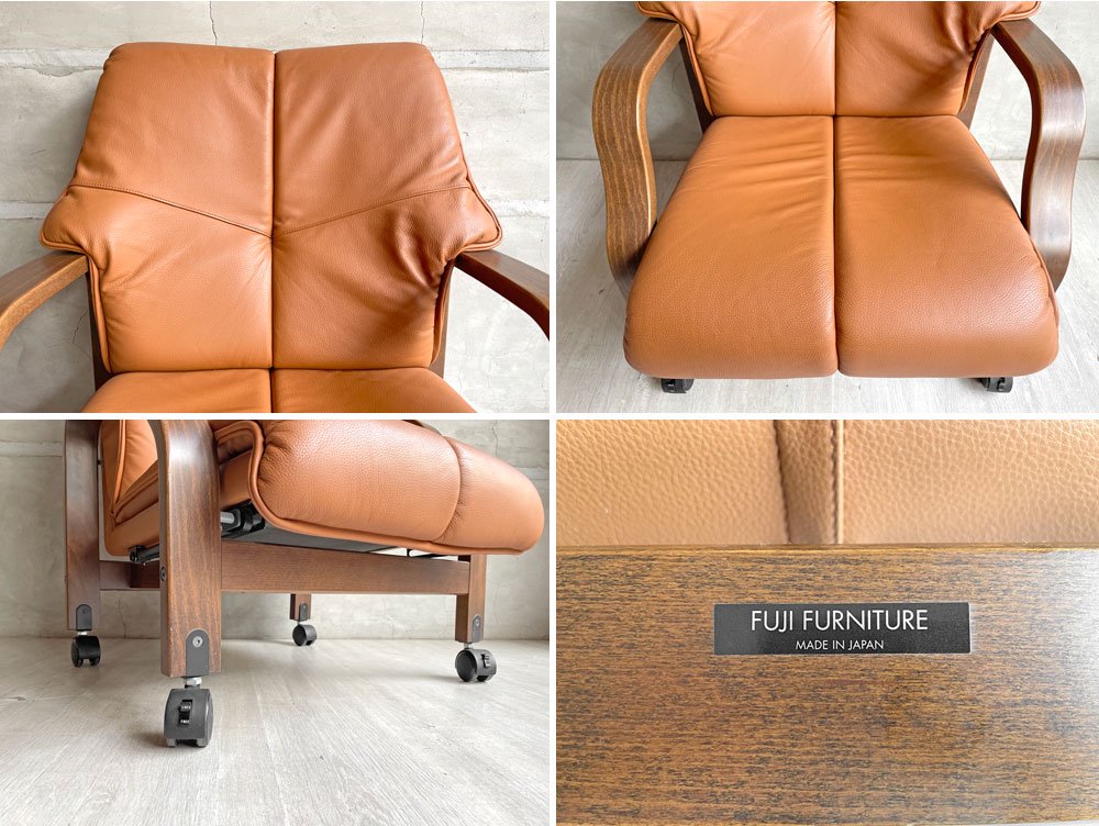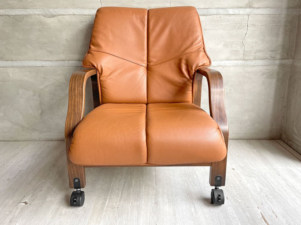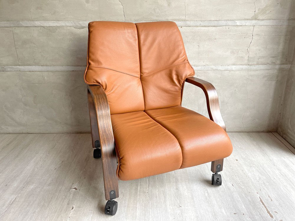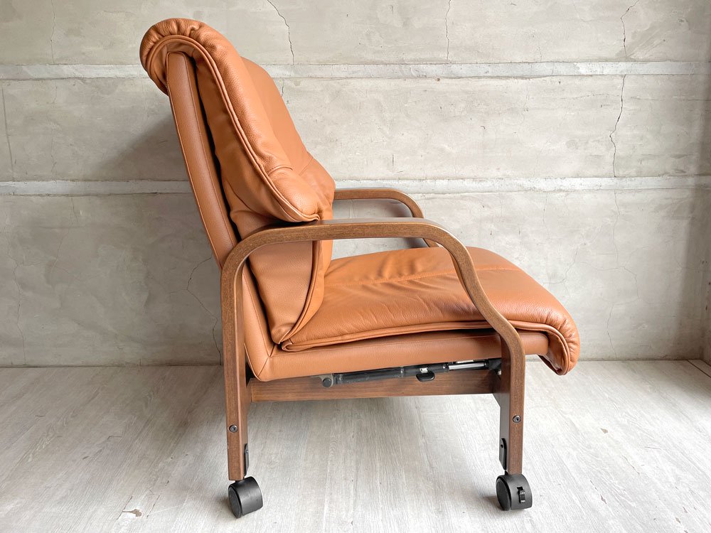 冨士ファニチア FUJI FURNITURE キャスター付き リクライニングチェア アームチェア プライウッド 本革 ブラウン系 廃番 A ♪
