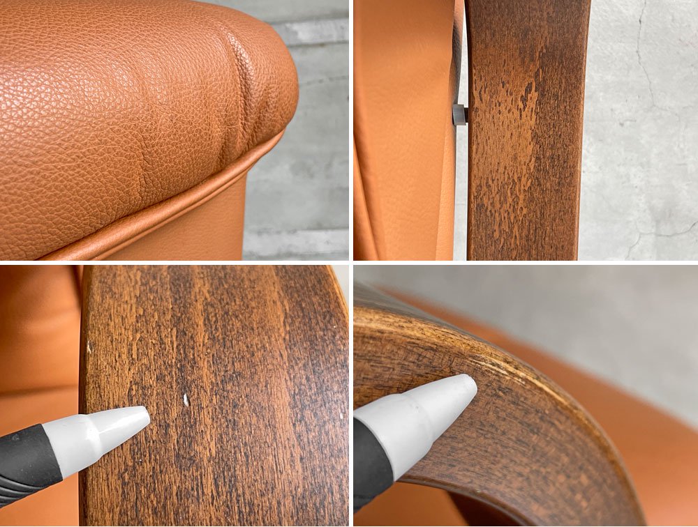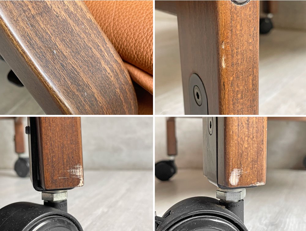 レザーに一部黒ずみが見られるとともに、アーム裏部分にやや目立つ色落ち、フレームにペイントロスを伴う打痕や擦れが散見されます。その他グラつき、レザーの破れなど大きなダメージは無く、これからも実用頂けるコンディションを保っております。