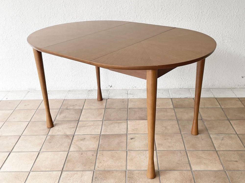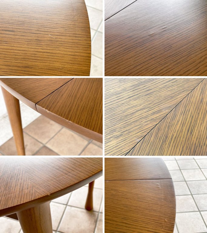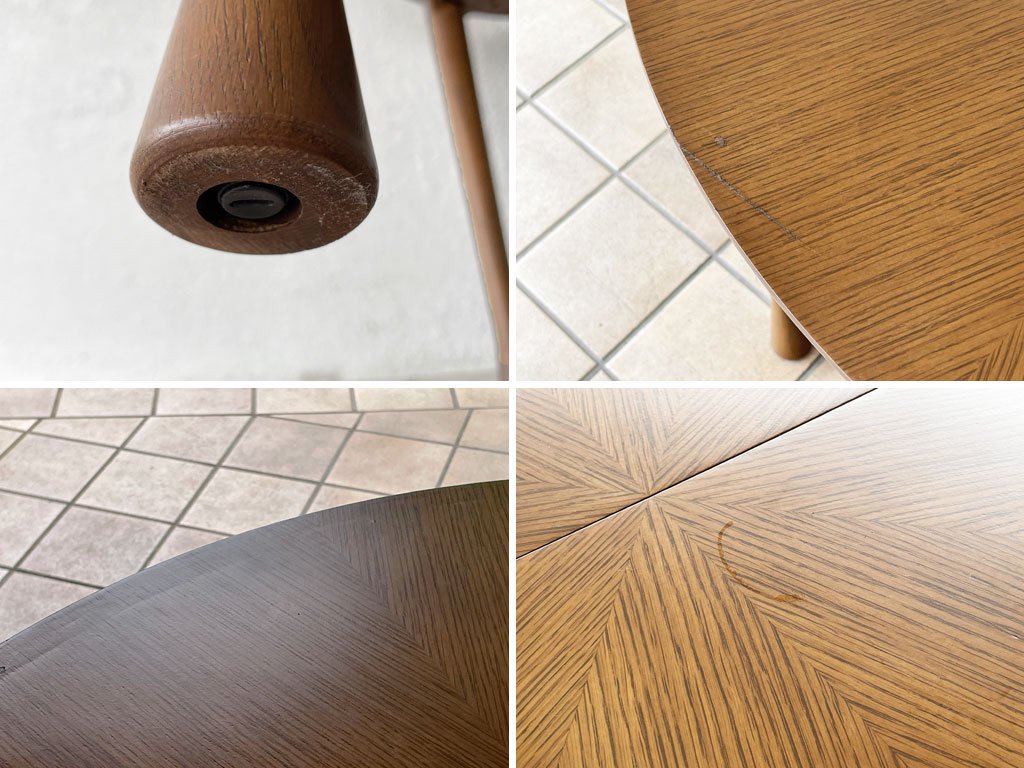 使用に伴い天板に一部線傷とそれに伴う表面塗装の剥がれ、光の加減で見える程度の輪染み、縁に細かな打痕、脚に僅かな擦れはございますが、いずれも著しく美観を損ねるものではございません。また天板縁には光の加減で見える程度の極僅かな膨らみがございますが、こちらは製造時からのものと思われます。エクステンション機構にも問題は無く、概ね良好なコンディションを保っております。
