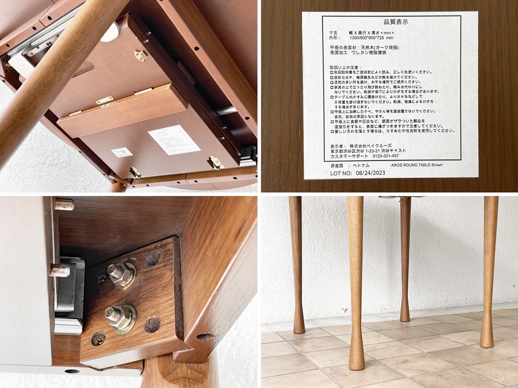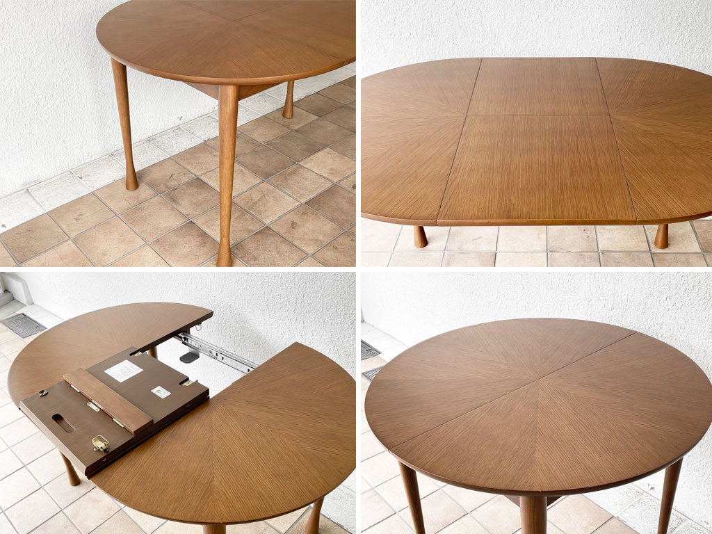Φ90cmとコンパクト目なサイズ設定の本テーブル。しかしながら天板下には追加天板がスッキリと収納されており、天板中央を開く事で130cmまで天板を拡張する事が可能です。