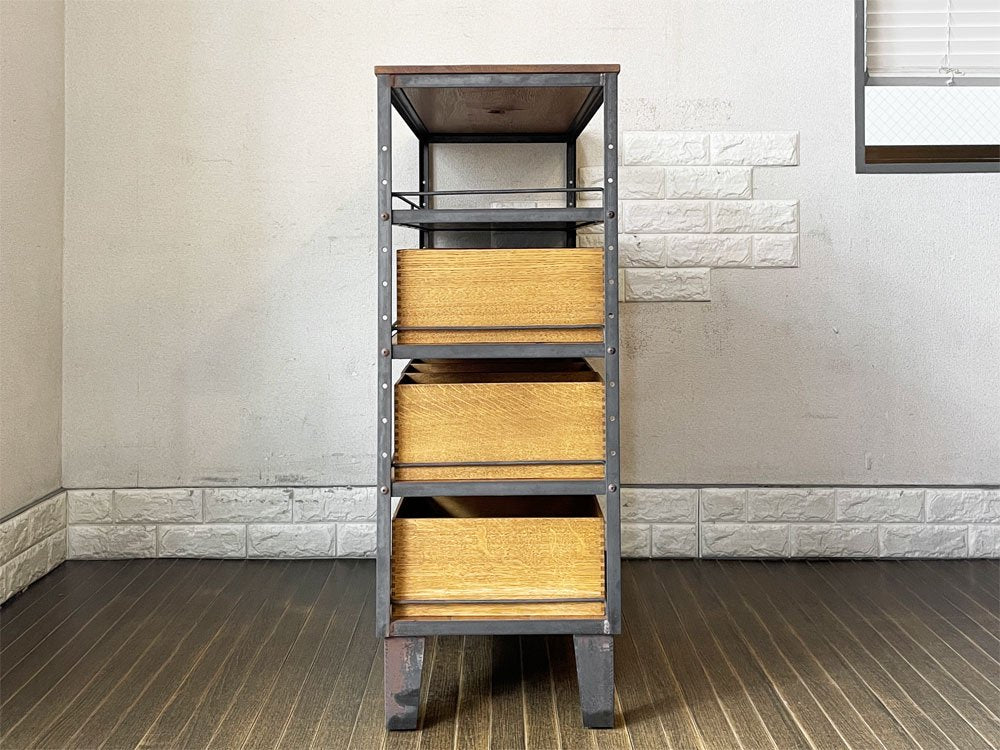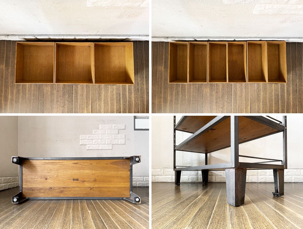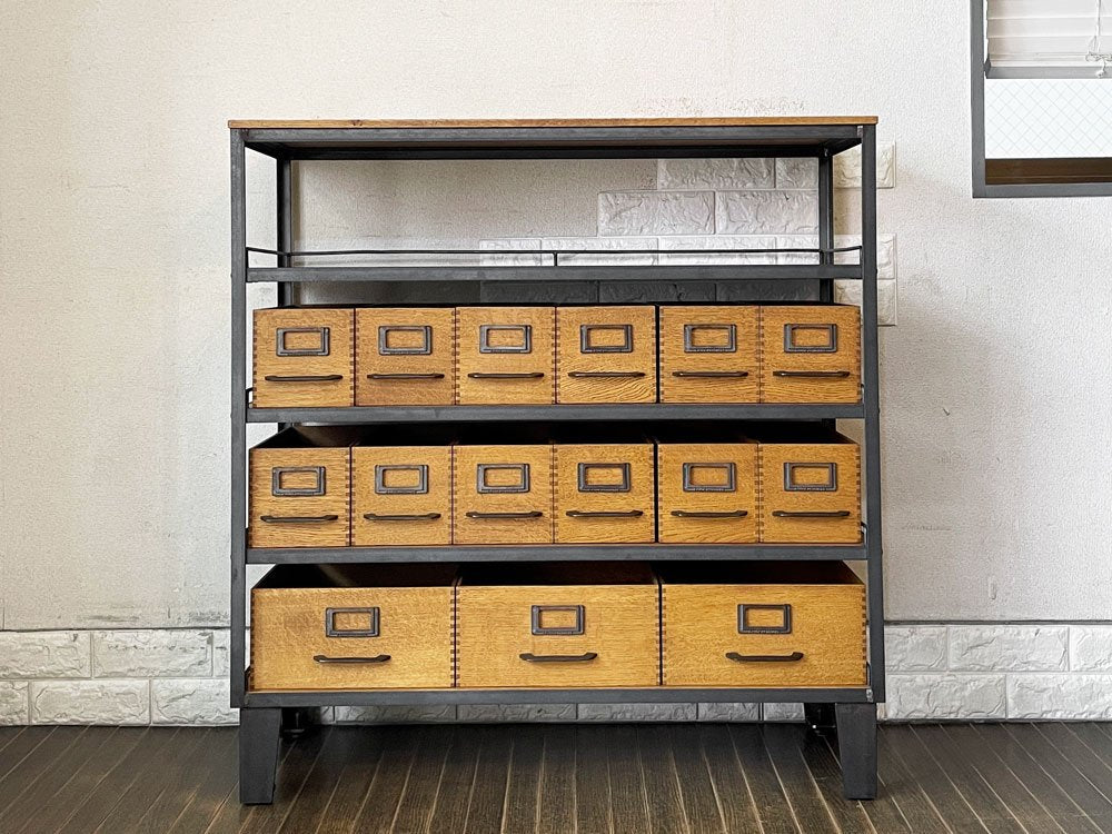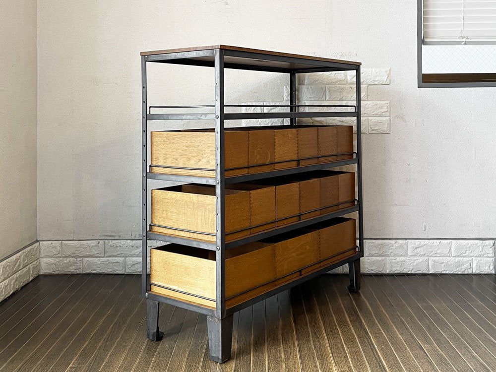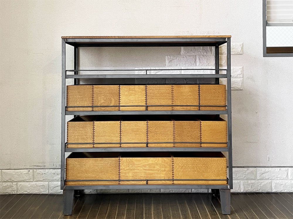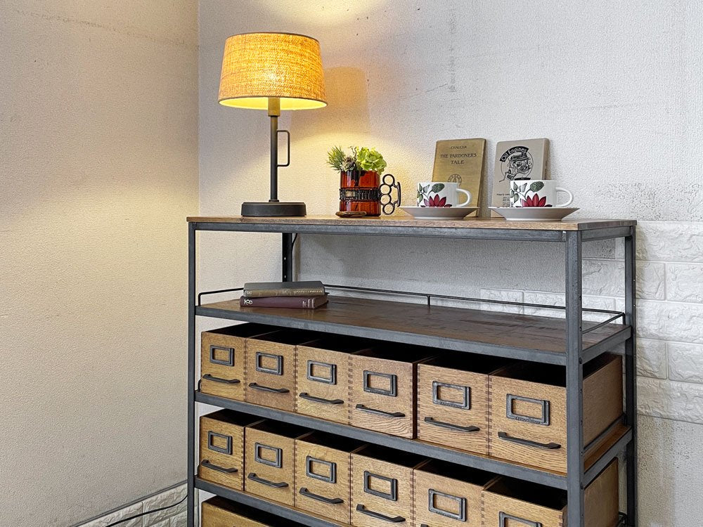 こちらは、オーク無垢材と無骨なアイアンを組み合わせたインダストリアルスタイルが人気の「エージーシェルフ | AG SHELF」。抽斗や箱が一面を埋め尽くすようにたくさん並ぶさまをイメージして作られました。