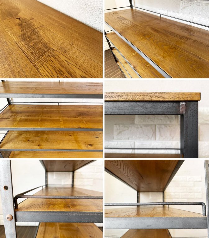 フレームには製造時にできたと思われる縁の欠けや色ムラ、擦れやくすみ、錆等が見受けられます。また、バーには若干の歪みが生じている箇所がございます。なお、棚板にはボックスの擦れ痕(色落ち)がやや目立つとともに、天板には輪染みが確認できます。その他、ボックスの側面の摩擦による色ムラやホルダーや把手のくすみや錆、使用に伴う擦れや傷、取り切れない汚れ等が全体にございますが、ご使用に問題となるダメージはございません。今後も安心して実用頂けるコンディションを保っております。