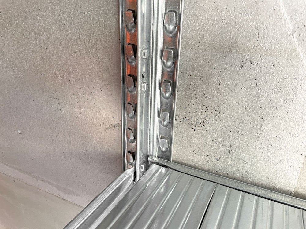 棚板は頑丈なスチールにリブ構造が施され、1枚あたりの耐荷重性能はなんと150kg、亜鉛メッキによって腐食やサビにも強く設計されています。