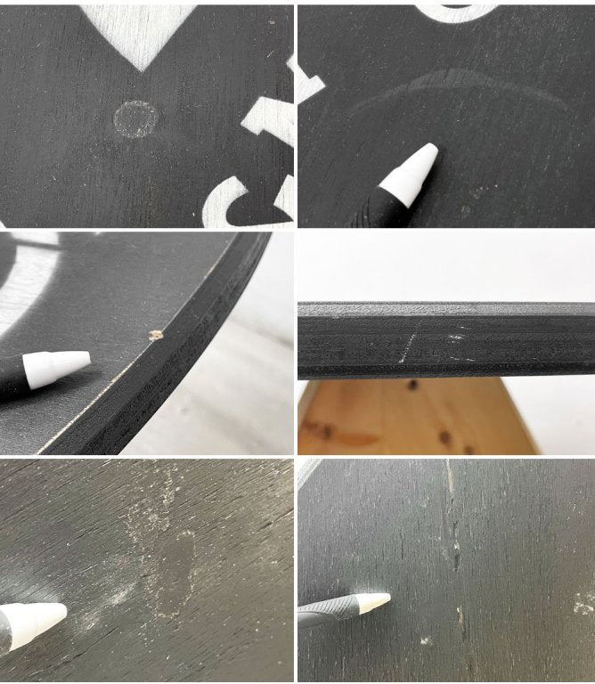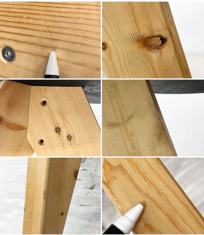 使用に伴い、天板には擦れや線傷、色ムラ、染み、打痕等が見受けられます。また脚部には線傷や擦れ、一部ネジが欠品している箇所がございますが実用強度には問題はございません。その他、取り切れない汚れや黒ずみ、ザラツキがございます。なお、全体的にお香のような匂いが強く感じられますので、においに敏感な方はご購入をお控えいただくのをお勧めいたします。使用上問題となる大きなダメージはございませんが、現状品としての販売となりますので予めご了承くださいませ。