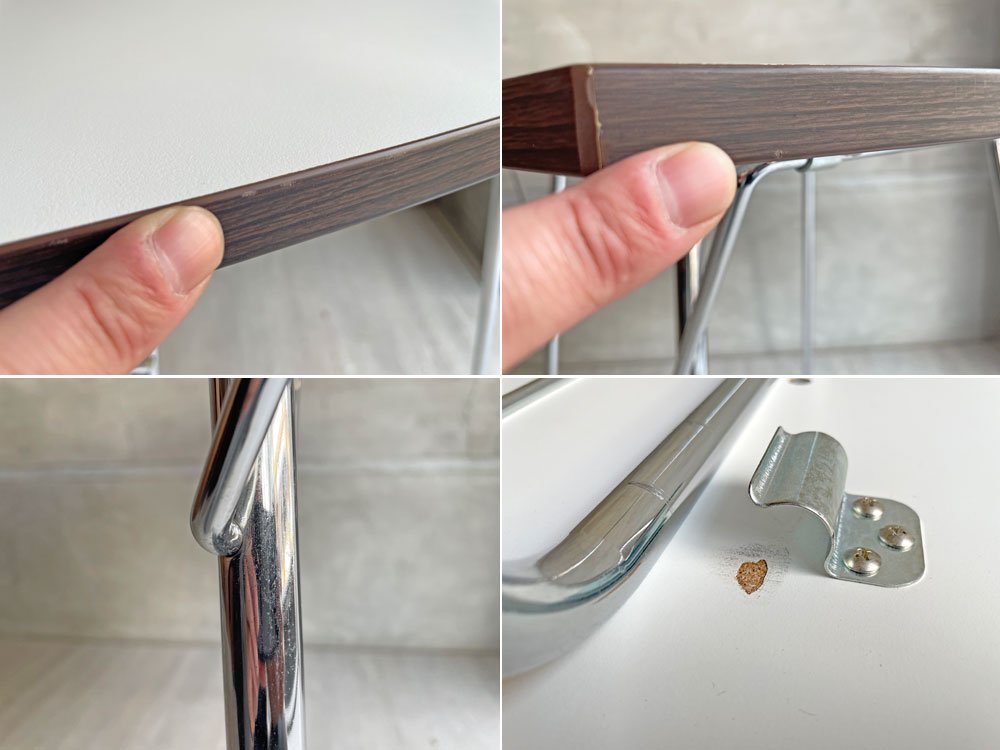 脚部に取り切れないくすみ、縁に細かな打痕、裏面の脚取り付け部分に塗装剥がれが見られます。また、脚部のストッパーが欠品しておりますが、組み上げ時にしっかり固定されますので、通常通り使用する分には問題ございません。