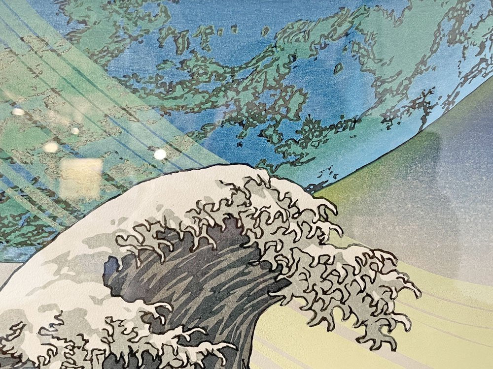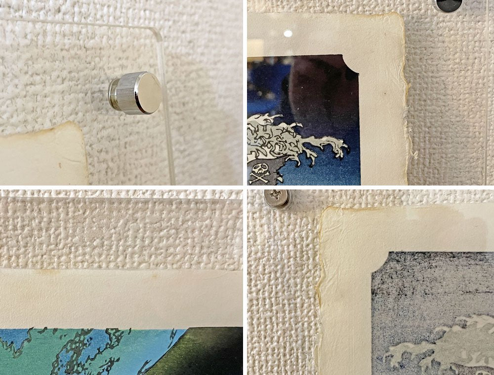 版画本体には、縁のヨレやシミ汚れ、黄ばみなどが確認できるとともに、アクリルフレームには全体に擦れや傷がございますが、いずれも著しく美観を損ねるものではございません。これからも気持ちよく鑑賞をお楽しみいただけます。