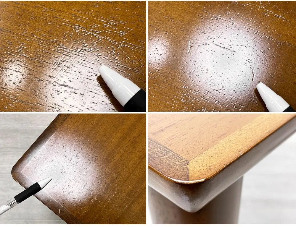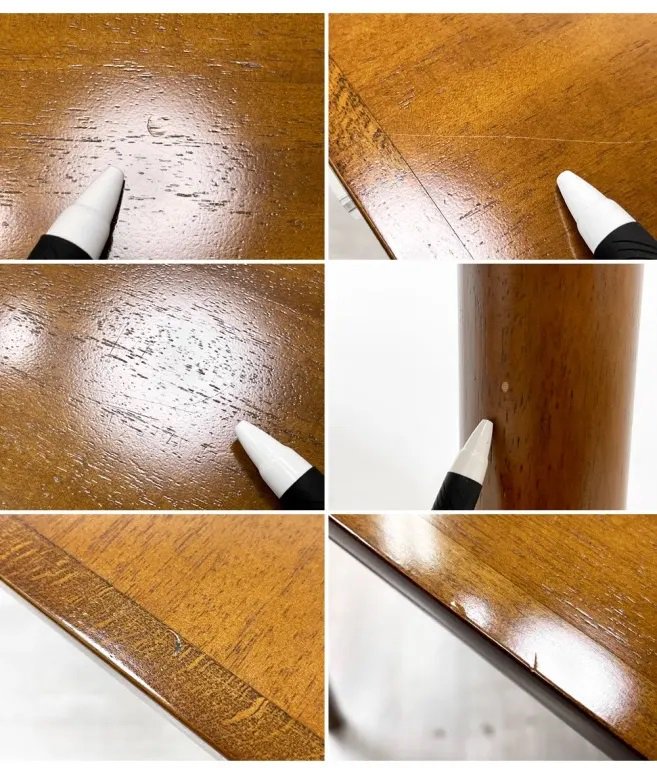 使用に伴う細かな擦れ傷の他、天板にはいくらかの打痕やスクラッチが見受けられますが光の加減で感じられる程度のものであり、いずれも大きく目立つものではございません。グラつき等ご使用に問題となるダメージも無く、今後とも気持ち良くお使い頂けるコンディションを保っております。