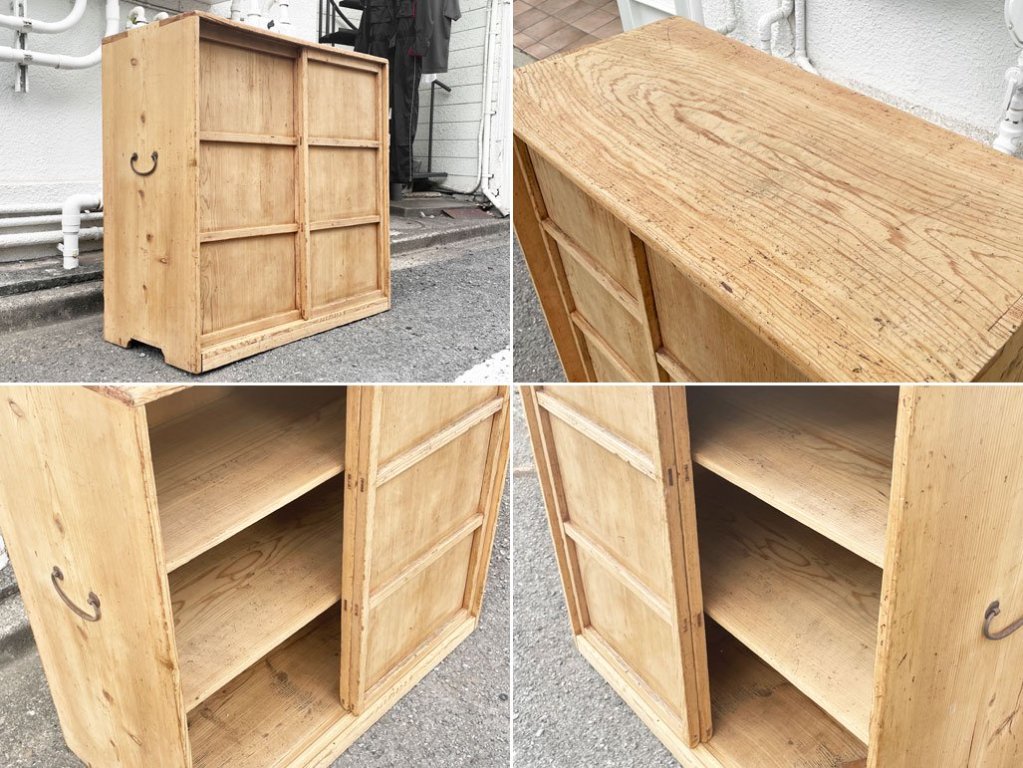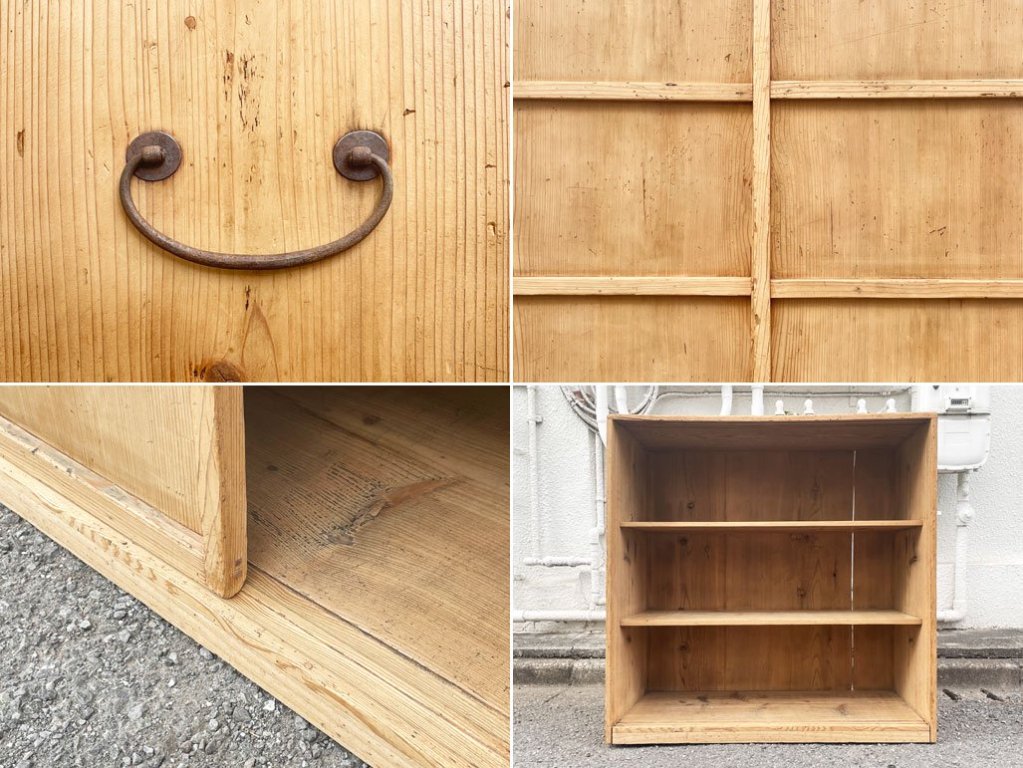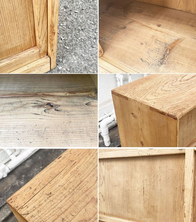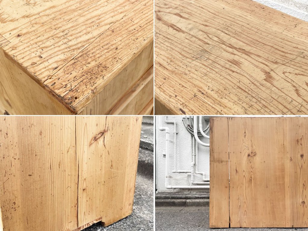 こちらはビンテージ品です。擦れ、打痕や黒ずみ等全体的に経年なりのダメージが見られますが、味としてお楽しみ頂けます。その他棚板に節の抜け、天板と側面にクラック、背面に隙間のある箇所等もございますが、使用上問題となるダメージは見受けられません。これからも安心してご使用頂けるコンディションを保っております。