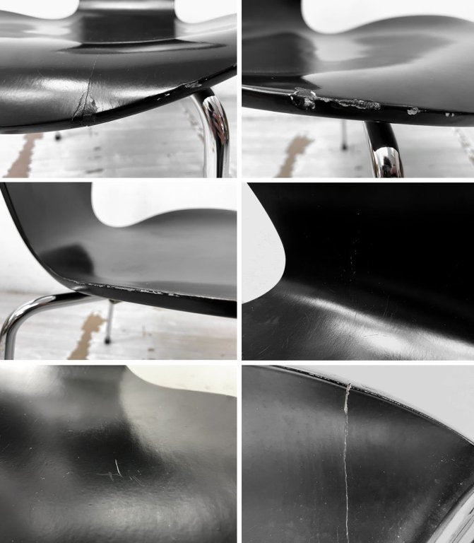 70kgのおもりにより50万回もの耐久性テストをクリアした、しなりのある強度をもつ積層合板。着座の際に身体のラインにフィットするように、緻密に計算された曲線は、座らない時でも美しいシルエットを楽しむことが出来ます。 またスタッキング可能で手狭な日本の住宅事情にも嬉しい設計。 曲線の美しさと機能性をあわせ持つ名品です。