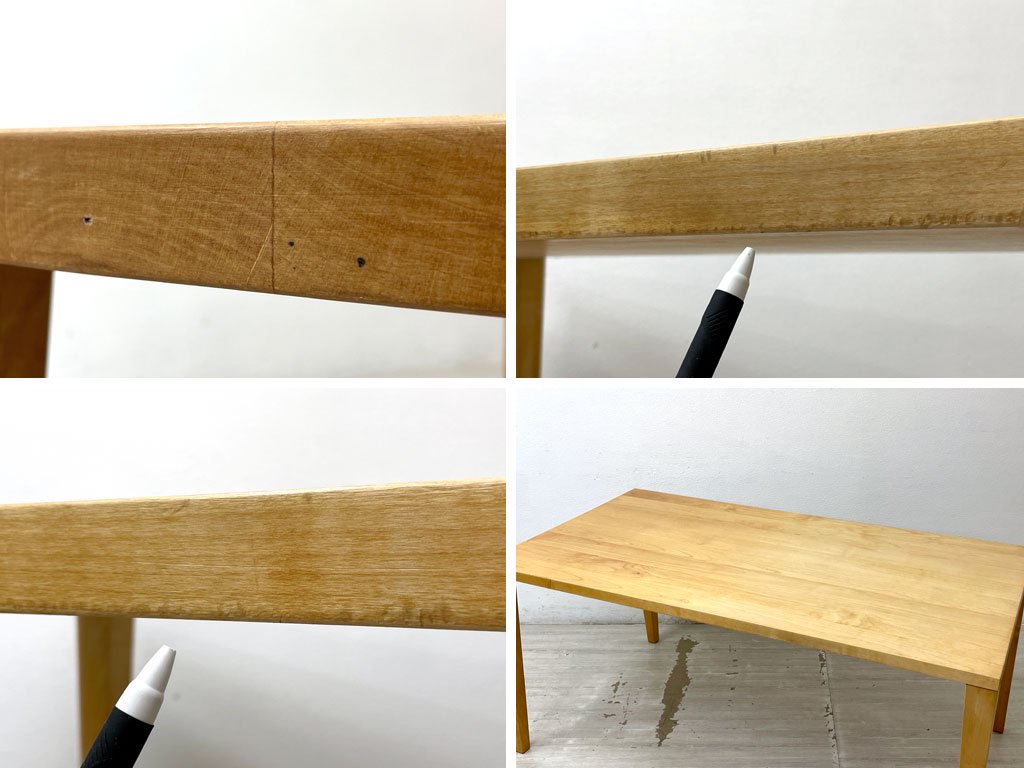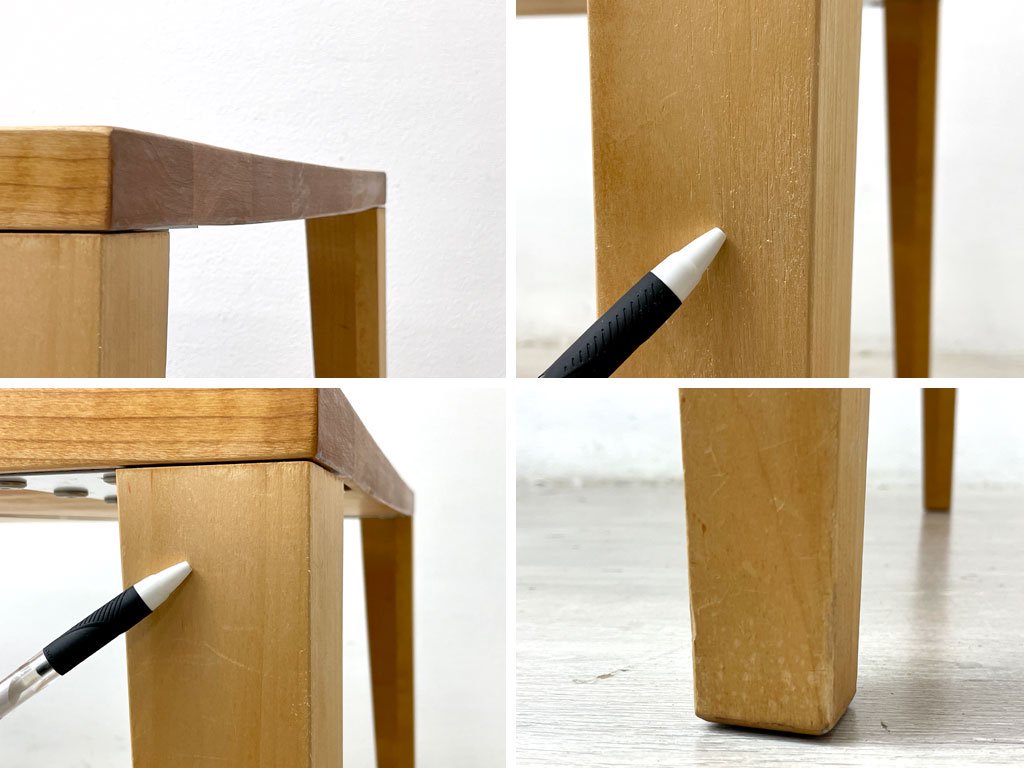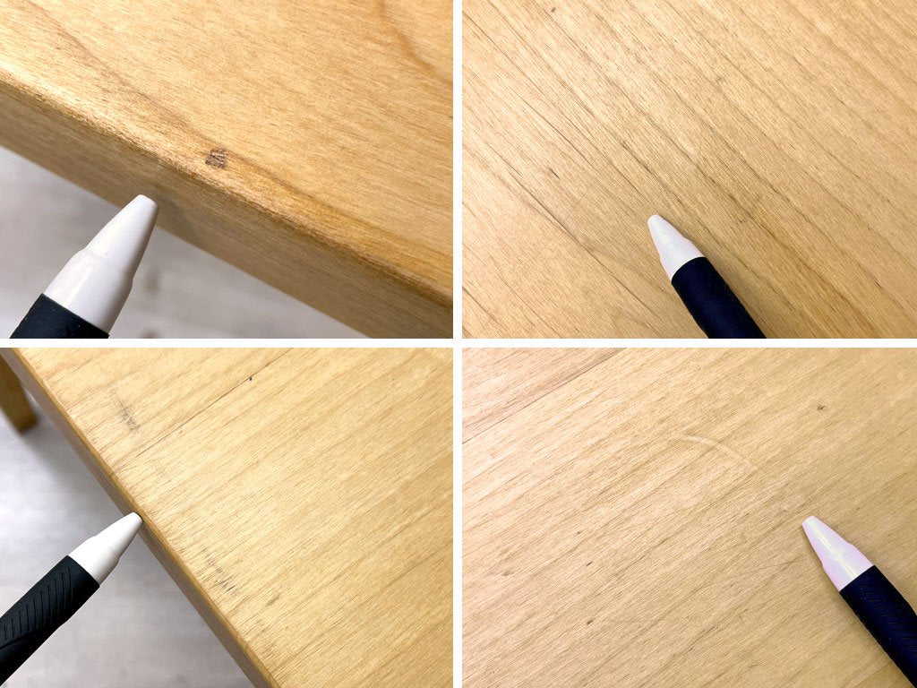 使用に伴う擦れ傷の他、細かなスクラッチ、天板にはわずかに色合いのムラや反り、長辺を中心とした打痕、脚部には木肌の荒れや染み等やや使用感はございますが、いずれも大きく風合いを損なうものではございません。天面に関しては近年サンディング及びオイル仕上げが施されているようで良好な状態を保っております。グラつき等ご使用に問題となるダメージの見られない、USED品として概ね良好なコンディションを保っております。